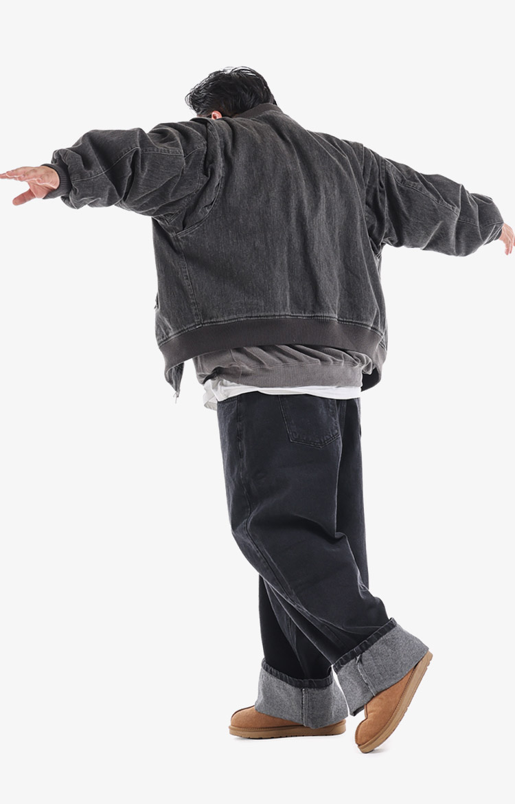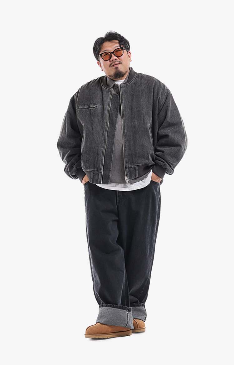 차콜 데님 자켓과 그레이 후드, 블랙 와이드 데님의 레이어드 룩으로 스트릿 캐주얼을 완성, 선글라스로 자신감을 표현했다.착용 사이즈 : 상의 4XL~5XL / 하의 5XL스타일리스트 : pilyeye