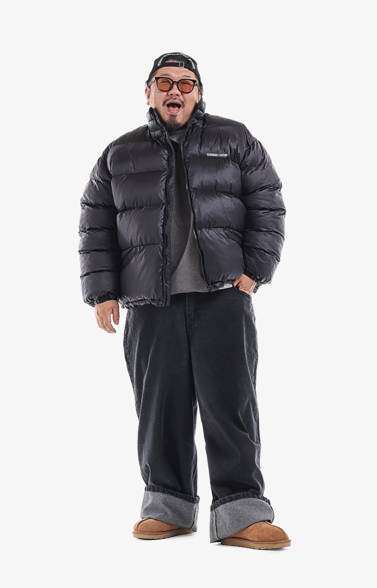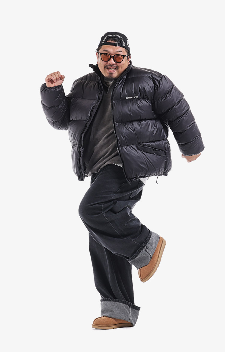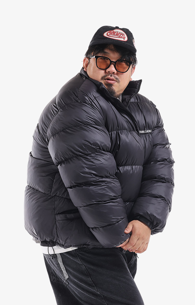 블랙 볼륨 패딩과 그레이 후드의 조합으로 겨울 스트릿 무드를 강조, 캡으로 캐주얼함을 더했다.착용 사이즈 : 상의 4XL~5XL / 하의 5XL스타일리스트 : pilyeye