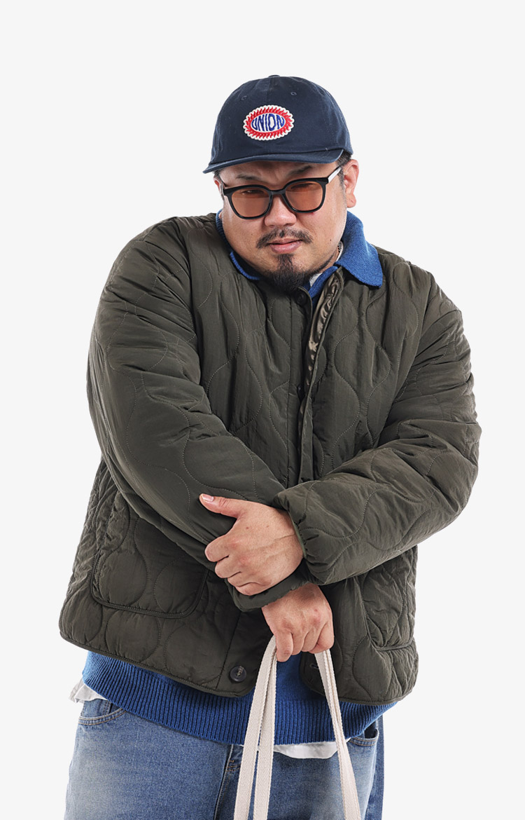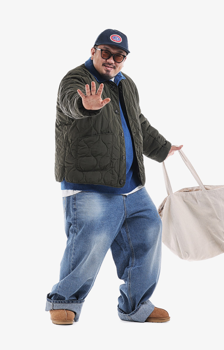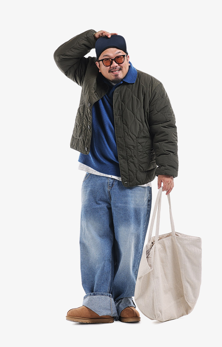 올리브 퀼팅 재킷과 블루 니트에 대형 에코백으로 실용성을 강조한 아웃도어 감성 룩.착용 사이즈 : 상의 4XL~5XL / 하의 5XL스타일리스트 : pilyeye