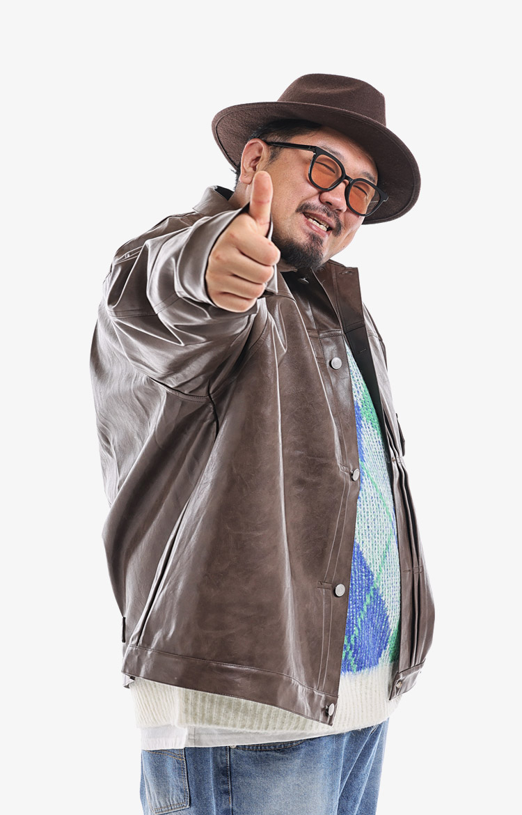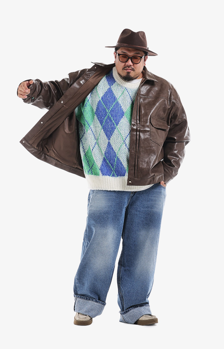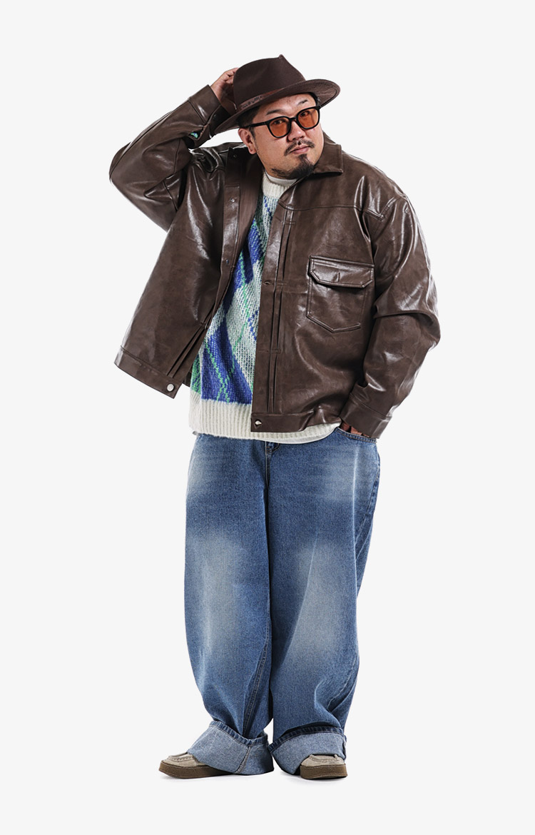 브라운 레더 재킷과 블루 그라데이션 니트에 펠트햇을 더해 클래식한 레트로 무드를 완성했다.착용 사이즈 : 상의 4XL~5XL / 하의 5XL스타일리스트 : pilyeye