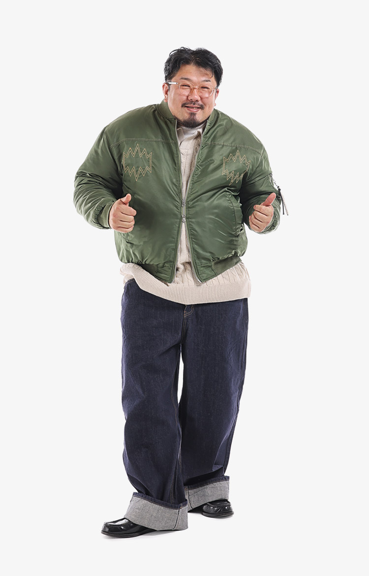 올리브 MA-1과 베이지 케이블 니트에 다크 데님으로 밀리터리와 캐주얼의 밸런스를 맞춘 룩.착용 사이즈 : 상의 4XL~5XL / 하의 5XL스타일리스트 : pilyeye