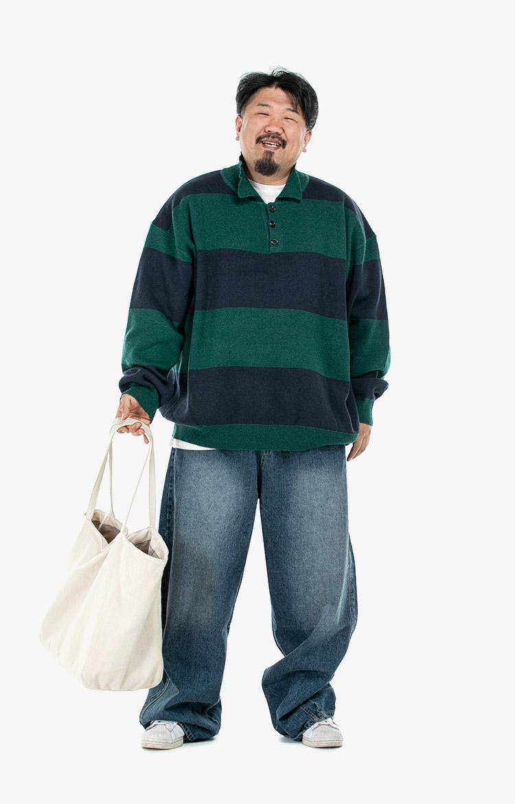스트라이프 니트와 데님팬츠를 매치한 스타일링