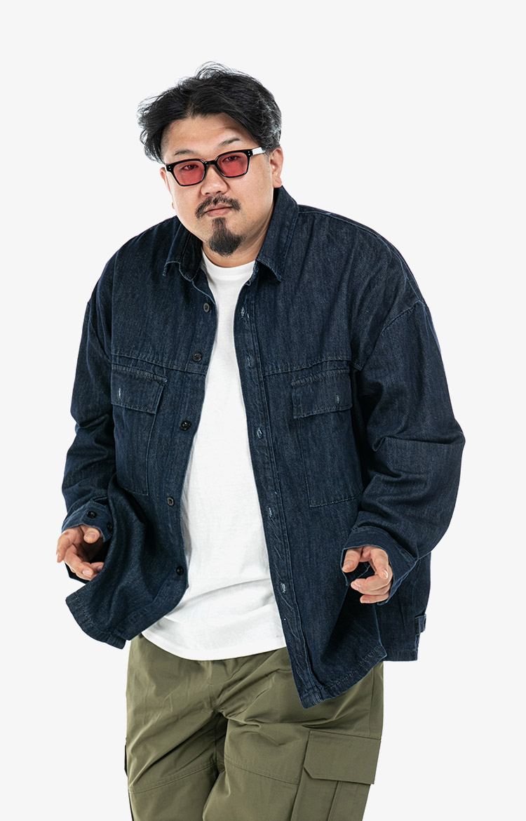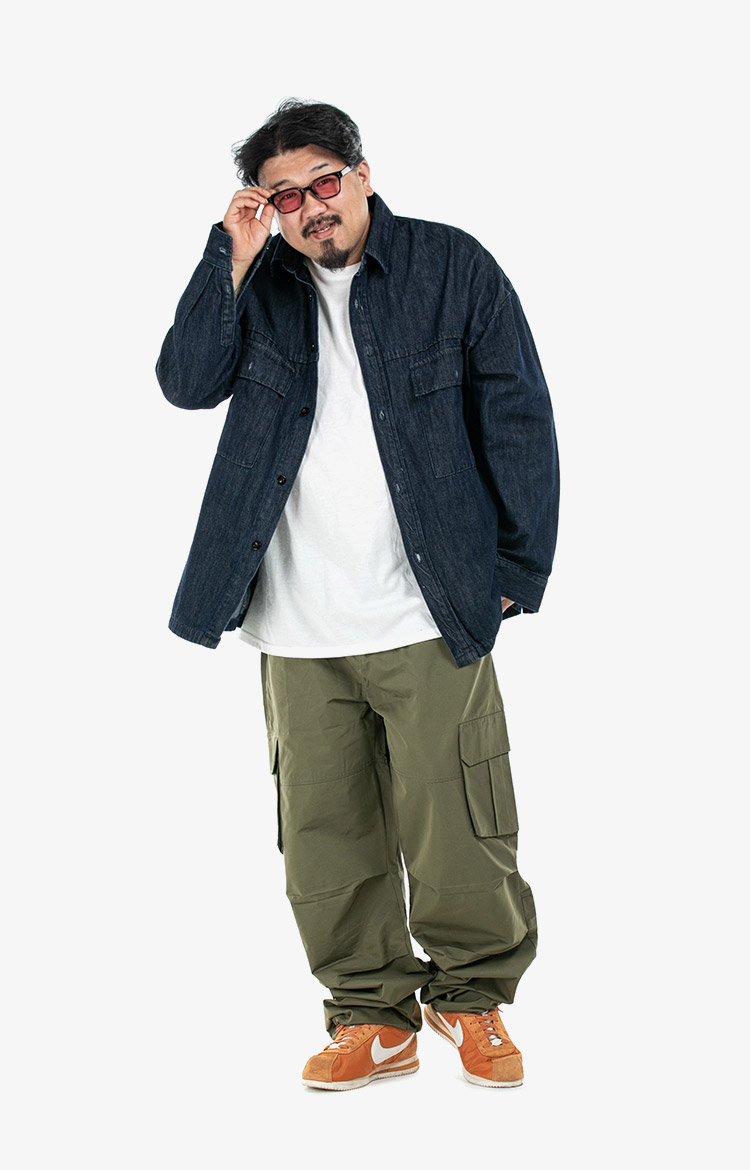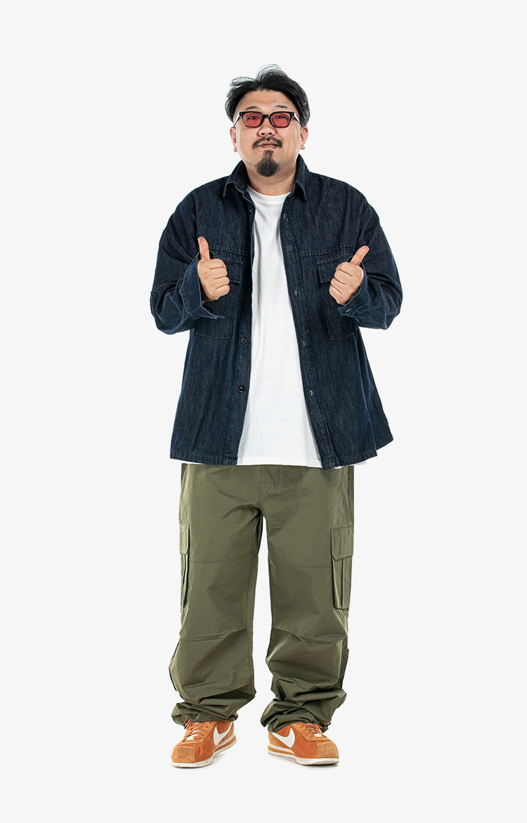 데님셔켓과 카고팬츠를 매치한 스타일링 착용 사이즈 : 상의 4XL~5XL / 하의 4(30-44) 스타일리스트 : SCENE