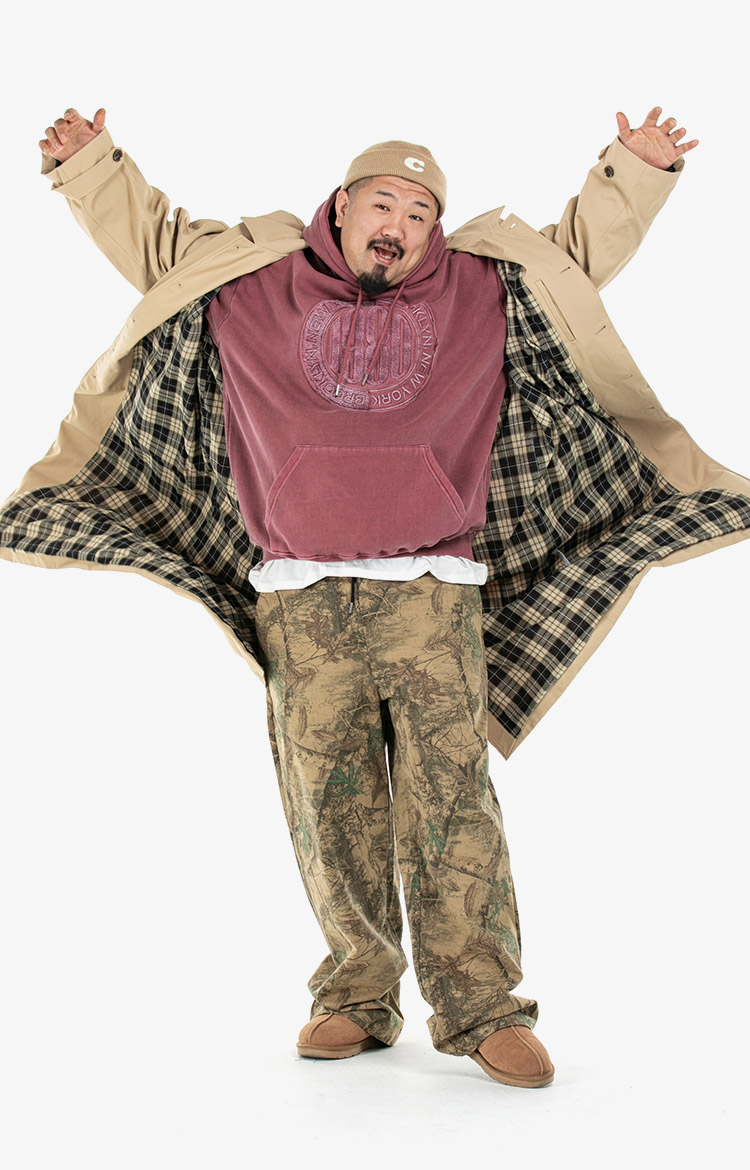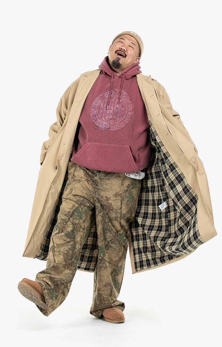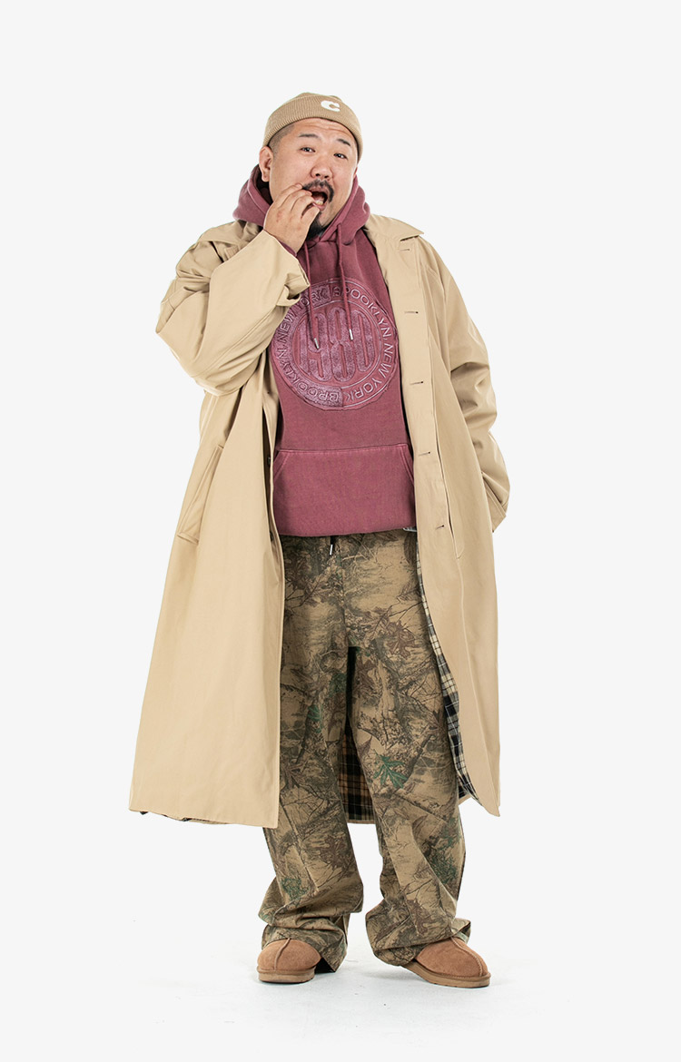 베이지 코트에 와인 후드를 레이어드한 스타일링착용 사이즈 : 상의 4XL~5XL / 하의 4XL~5XL스타일리스트 : SCENE