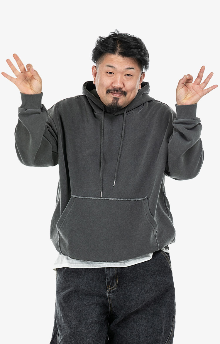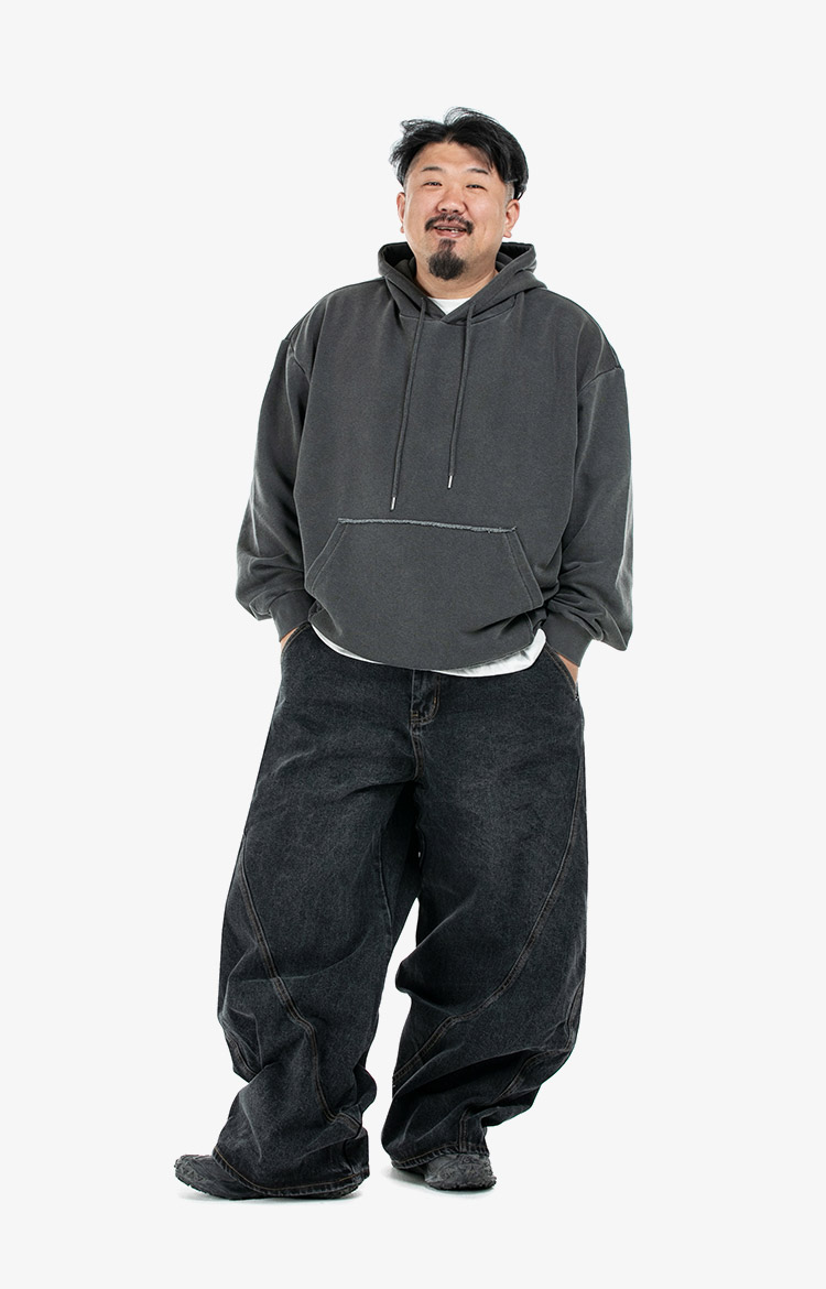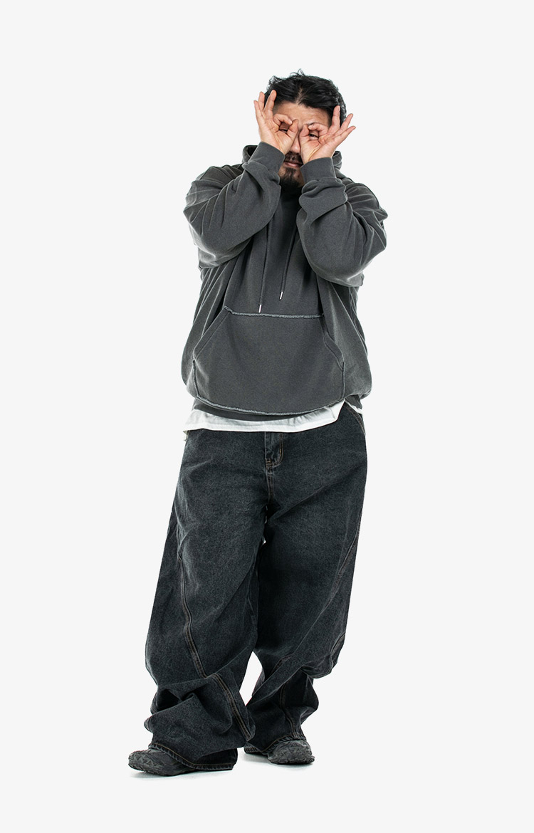 피그먼트 후드티와 데님팬츠를 매치한 스타일링