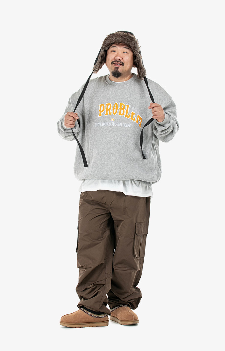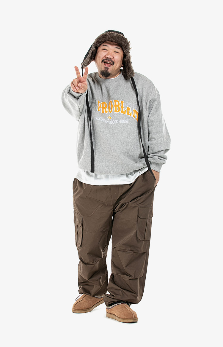 맨투맨과 카고팬츠를 매치한 스타일링 착용 사이즈 : 상의 4XL~5XL / 하의 4(30-44) 스타일리스트 : SCENE