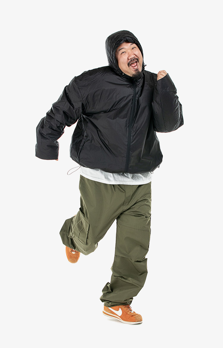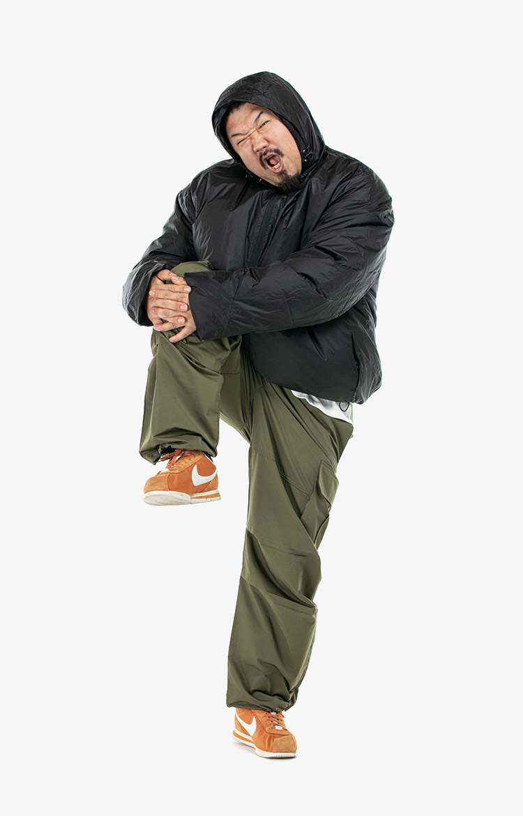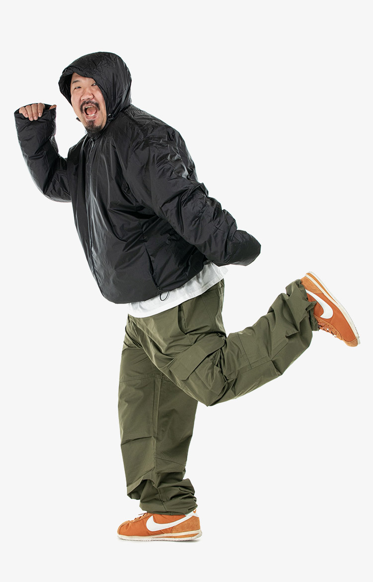 패딩점퍼와 카고팬츠를 매치한 스타일링