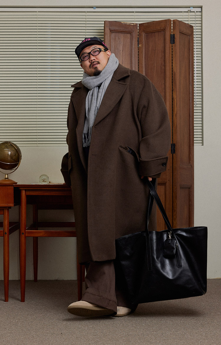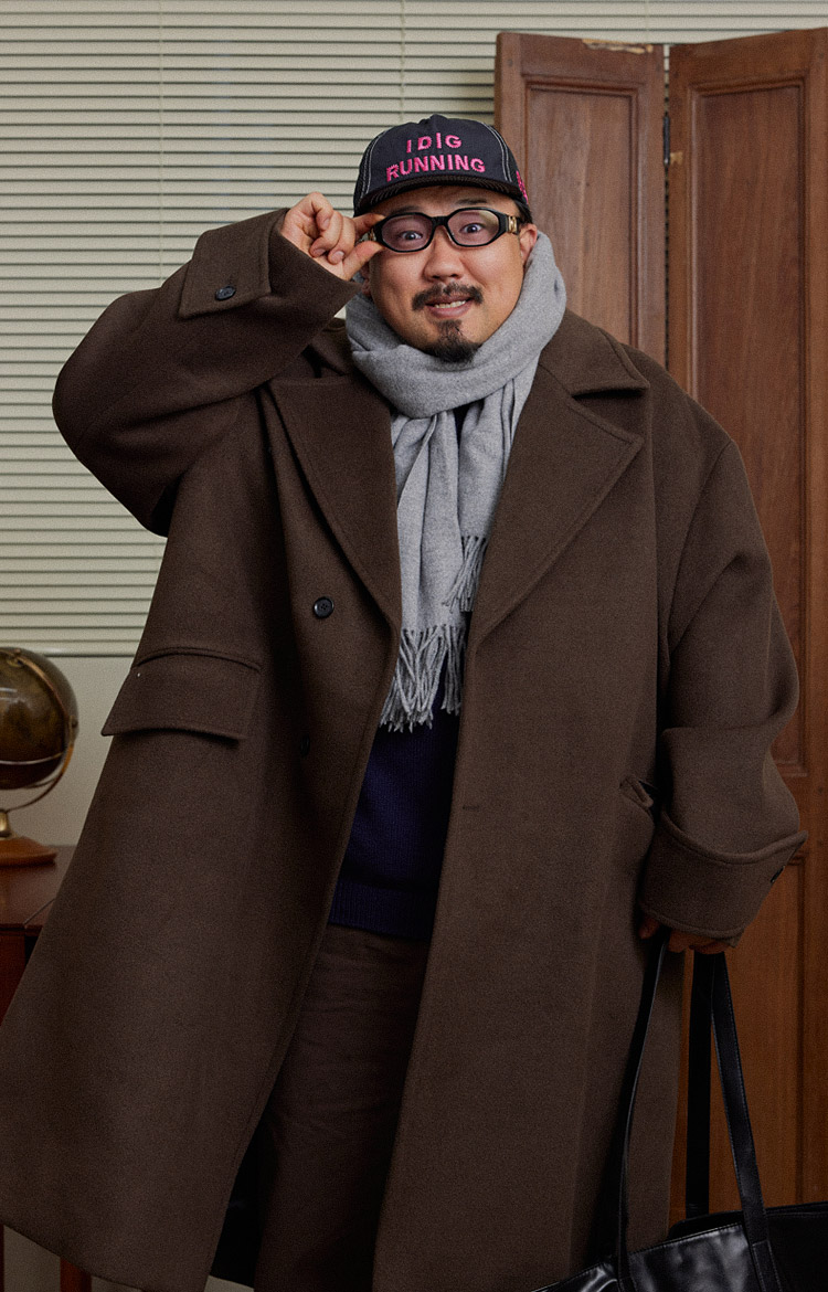 브라운 오버사이즈 코트에 그레이 머플러를 더해 클래식한 겨울 무드를 연출한 레이어드 룩.