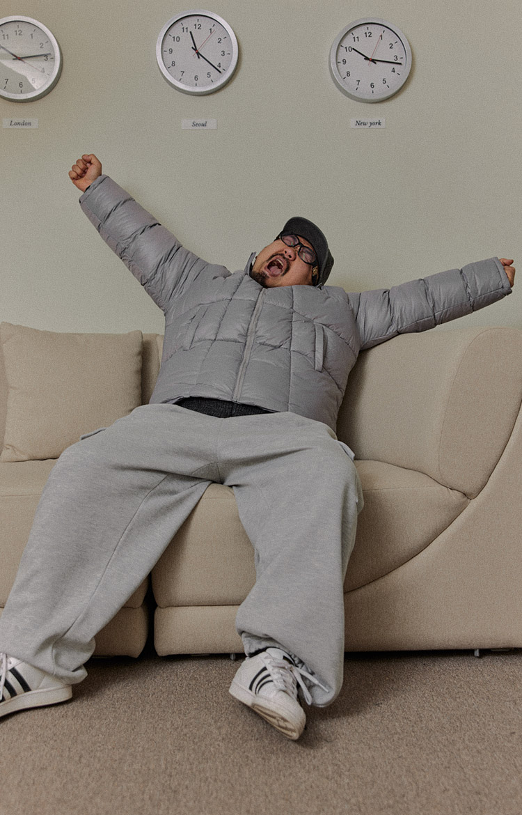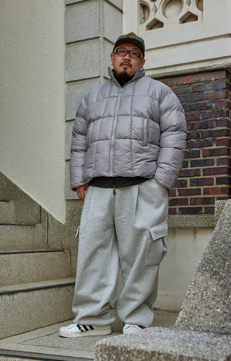 그레이 볼륨 패딩과 스웨트 팬츠의 톤온톤 매치로 편안하면서도 볼륨감 있는 겨울 룩.착용 사이즈 : 상의 4XL~5XL / 하의 5XL스타일리스트 : pilyeye