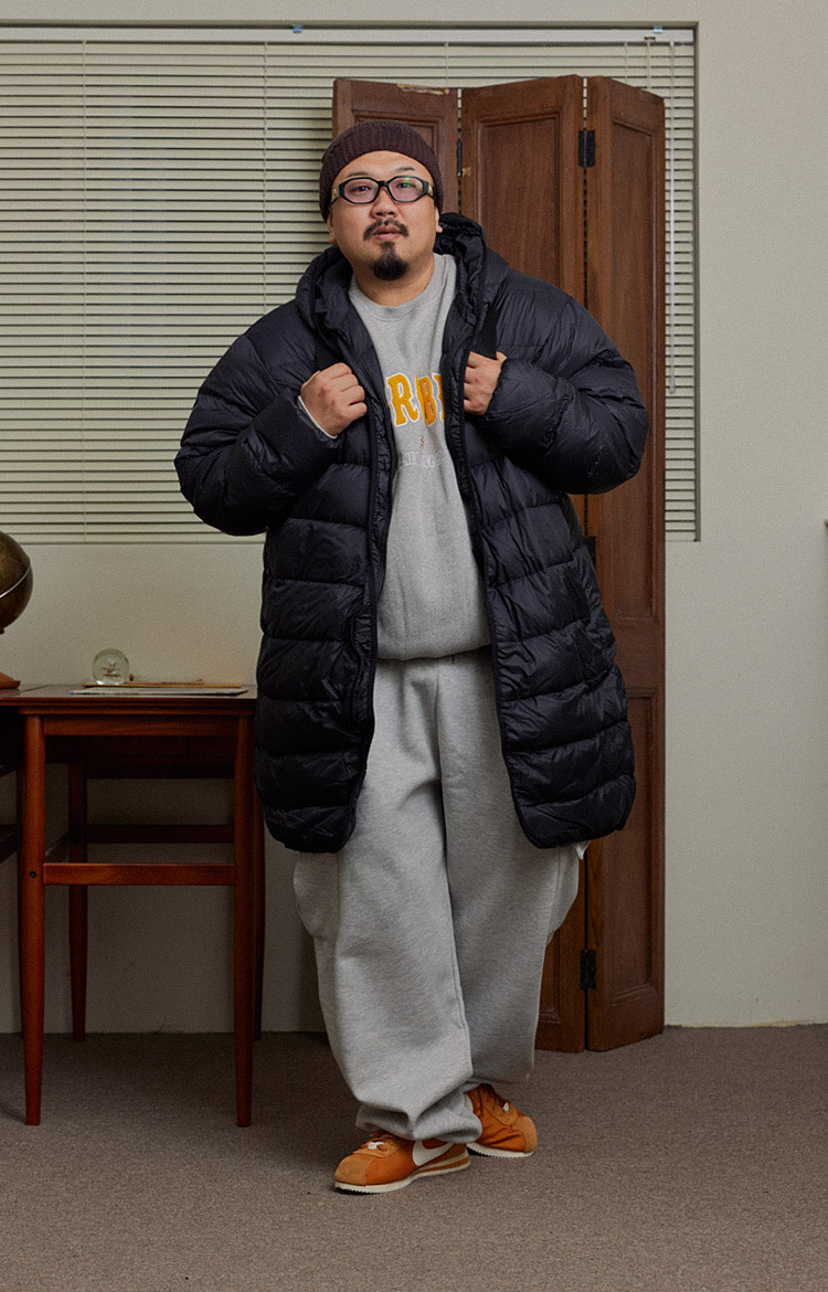 블랙 롱패딩과 그레이 후드 스웨트 셋업으로 실용성과 편안함을 모두 잡은 겨울 데일리 룩.