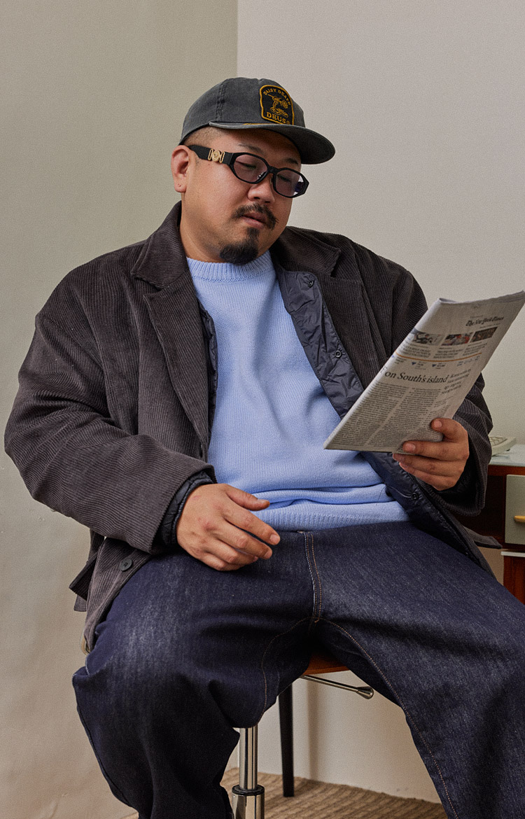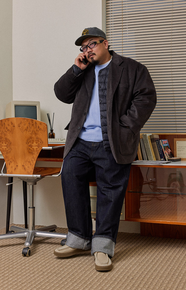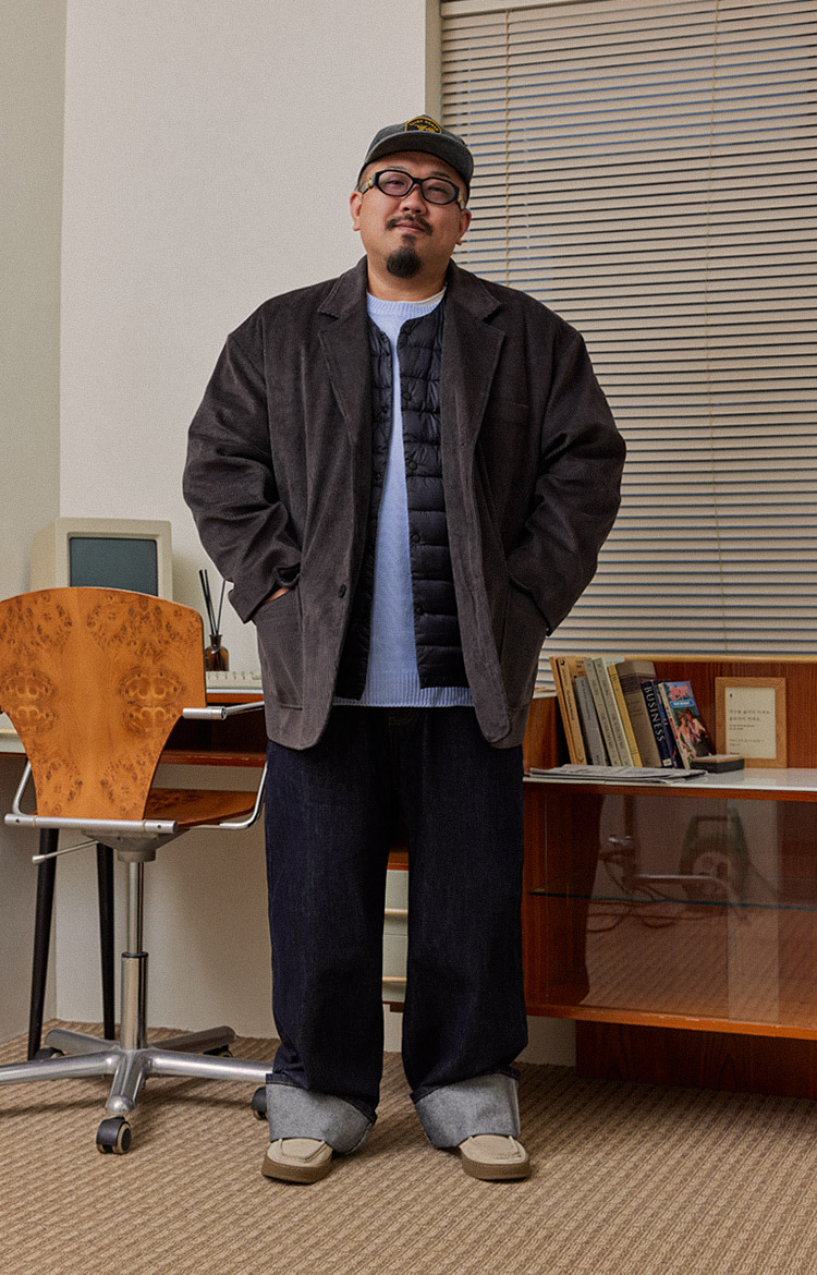 블랙 블레이저에 블루 니트 베스트를 레이어드하고 블랙 데님으로 세련된 캐주얼룩을 연출했다.착용 사이즈 : 상의 4XL~5XL / 하의 5XL스타일리스트 : pilyeye