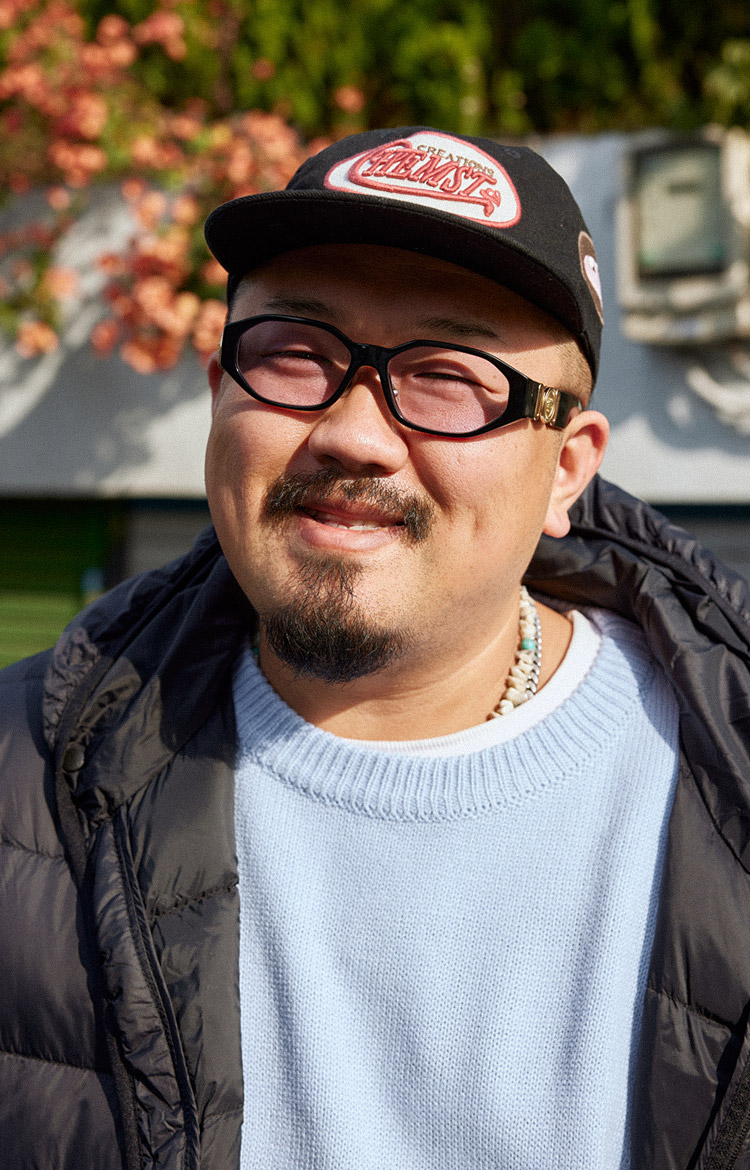 올리브그린 데님 재킷과 톤온톤 이너에 베이지 카고 팬츠로 밀리터리 감성을 강조한 스타일.