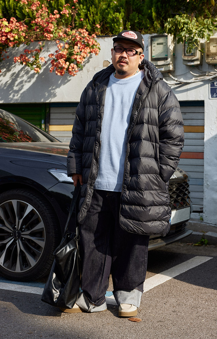 블랙 롱패딩과 그레이 후드 스웨트 셋업으로 실용성과 편안함을 모두 잡은 겨울 데일리 룩.