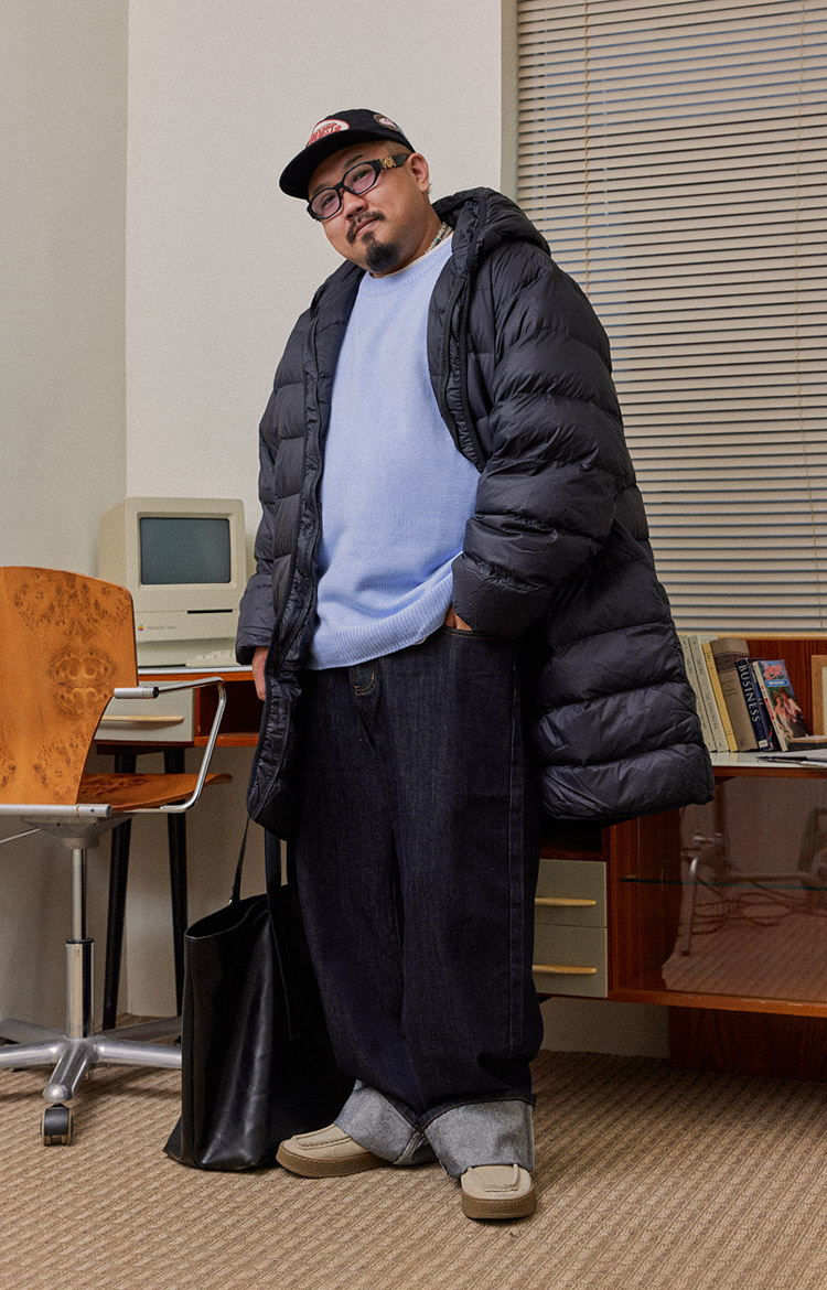 네이비 롱패딩과 블루 니트에 블랙 와이드 팬츠로 깔끔한 겨울 룩을 완성, 레더백으로 고급스러움을 더했다.