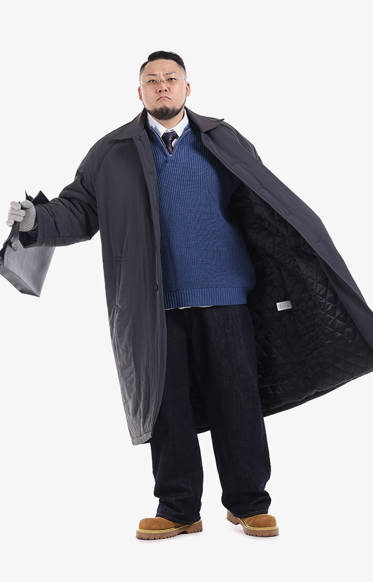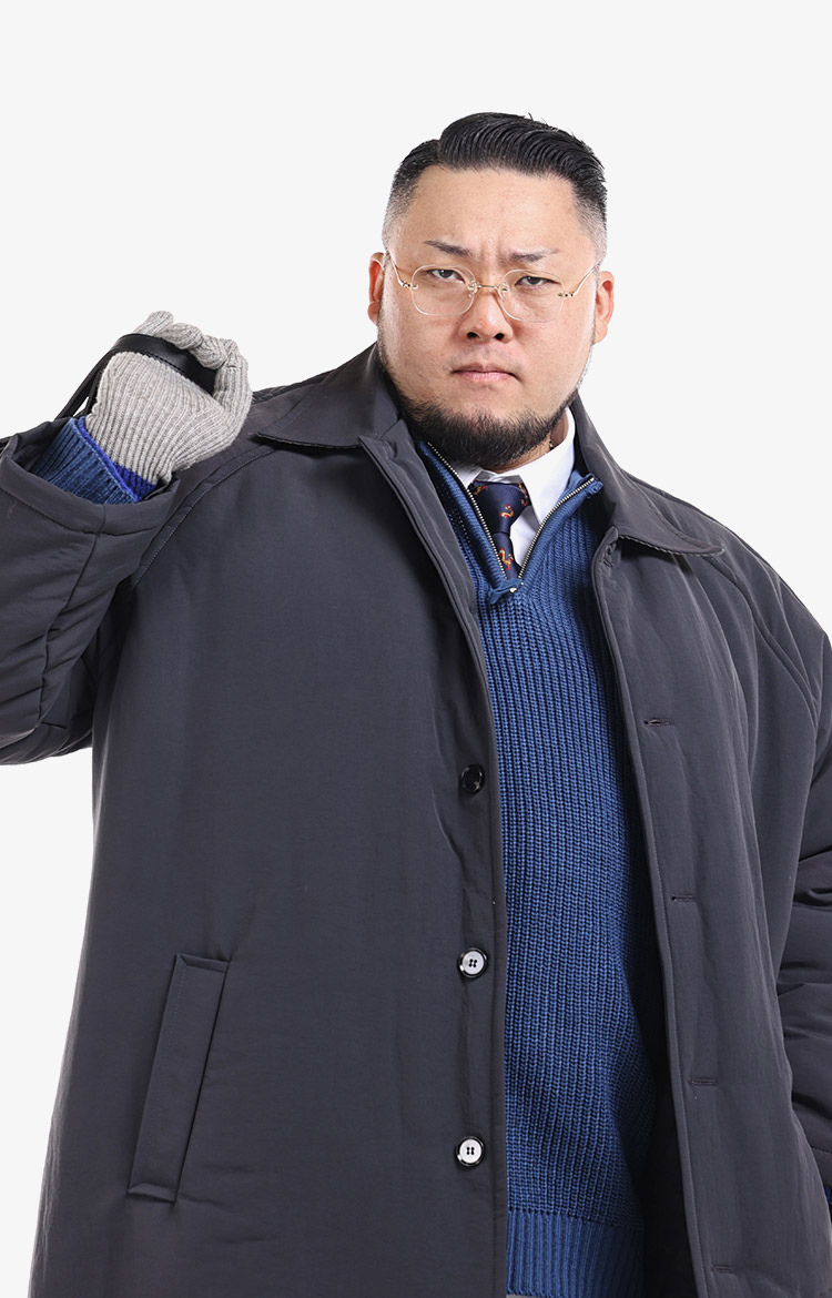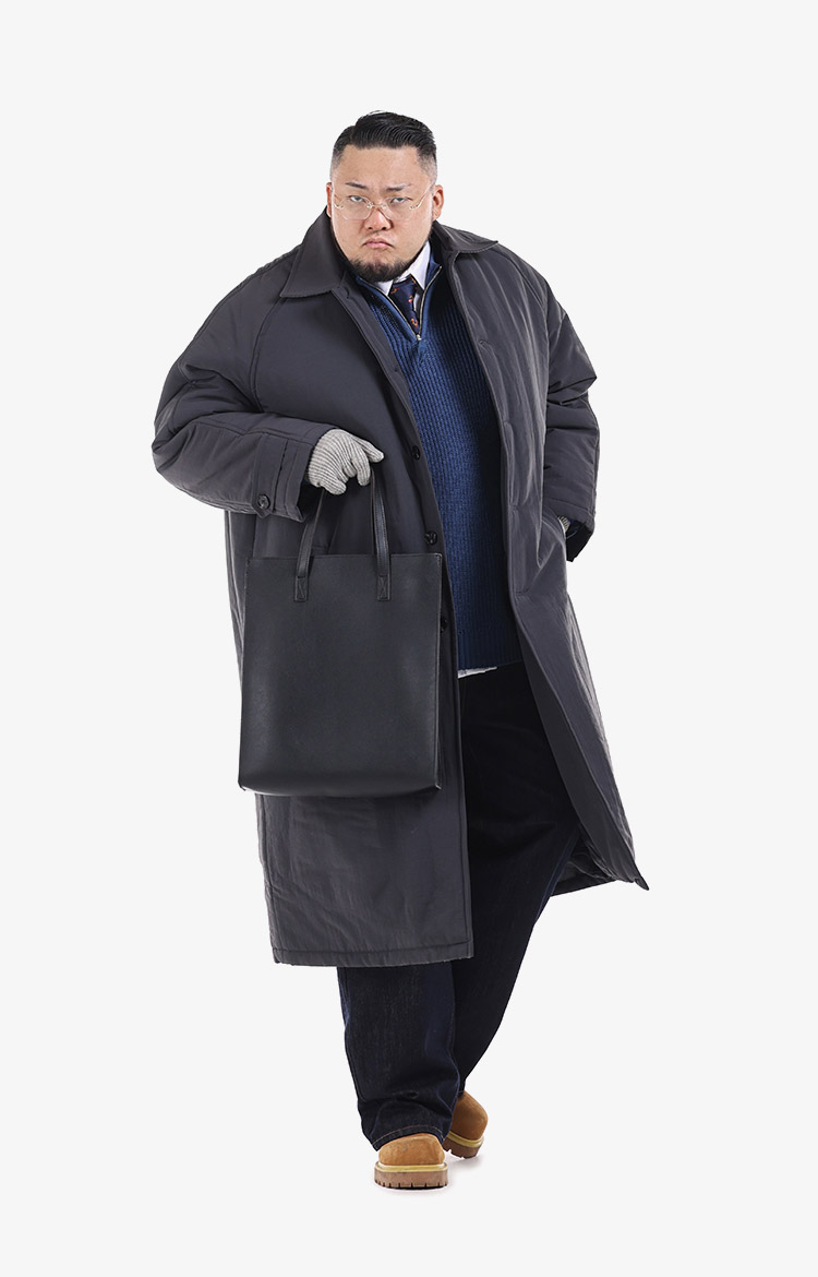 그레이 롱 패딩 코트와 블루 스트라이프 니트, 에코백을 매치한 비즈니스 캐주얼 룩에 니트 장갑으로 겨울 무드를 더했다. 착용 사이즈 : 상의 4XL~5XL / 하의 5XL스타일리스트 : Pilyeye