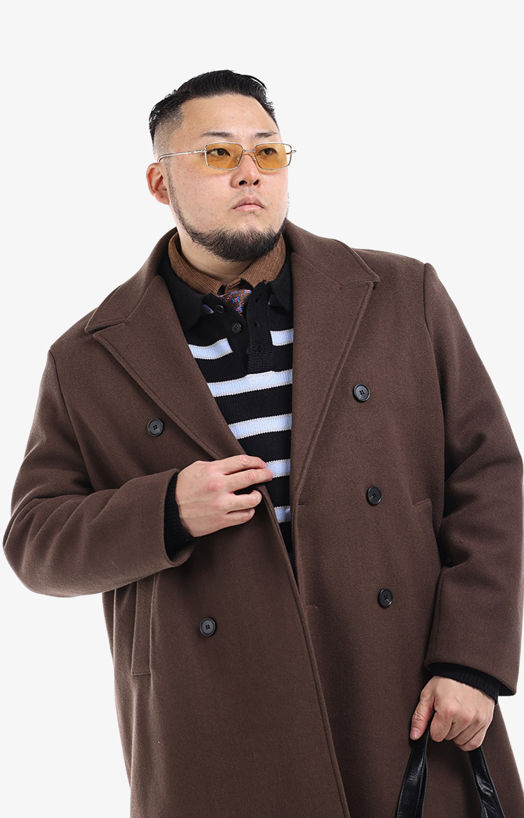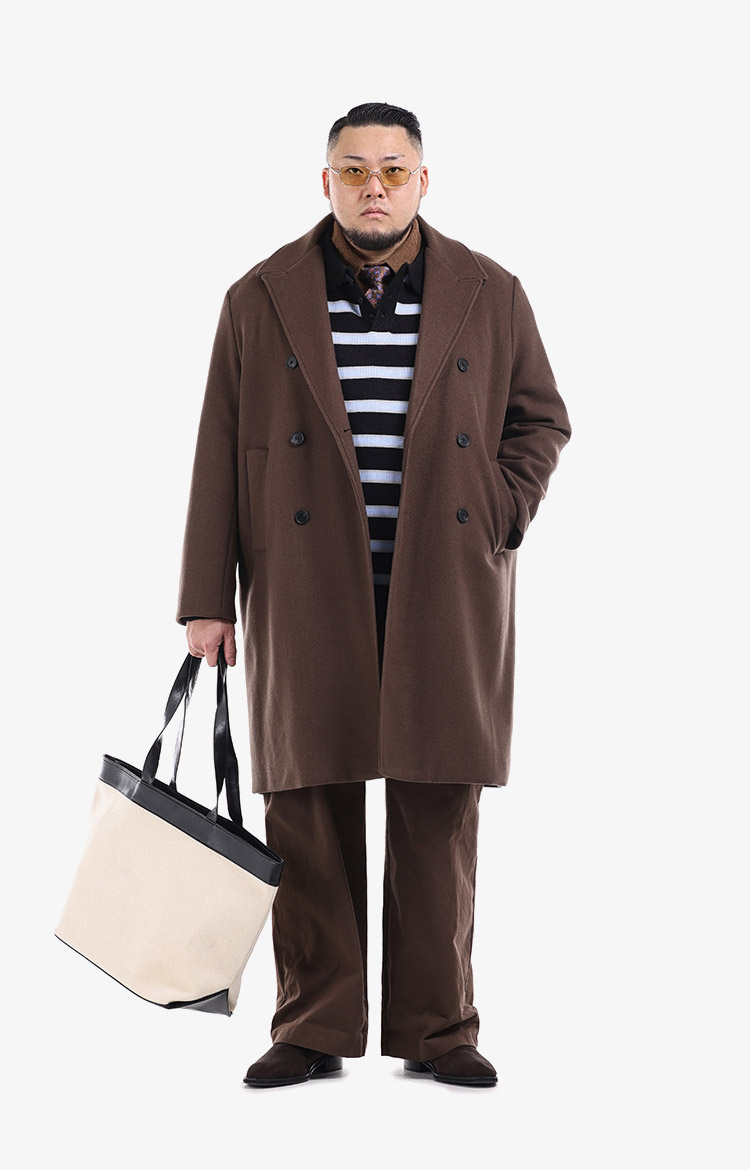 브라운 더블 코트와 스트라이프 니트, 선글라스로 클래식한 신사 무드를 연출한 겨울 비즈니스 룩.