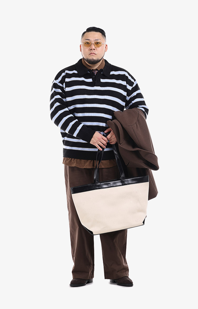 브라운 롱 코트와 스트라이프 니트, 캡과 에코백으로 캐주얼한 겨울 데일리 룩을 완성했다