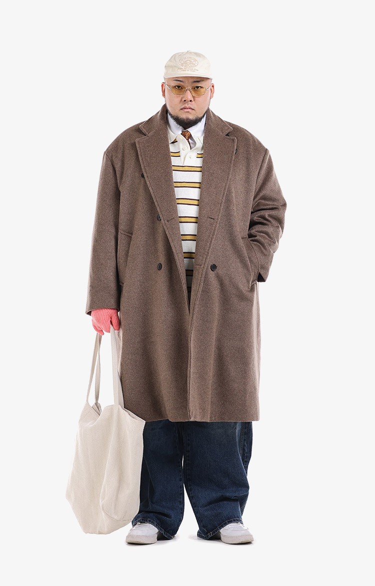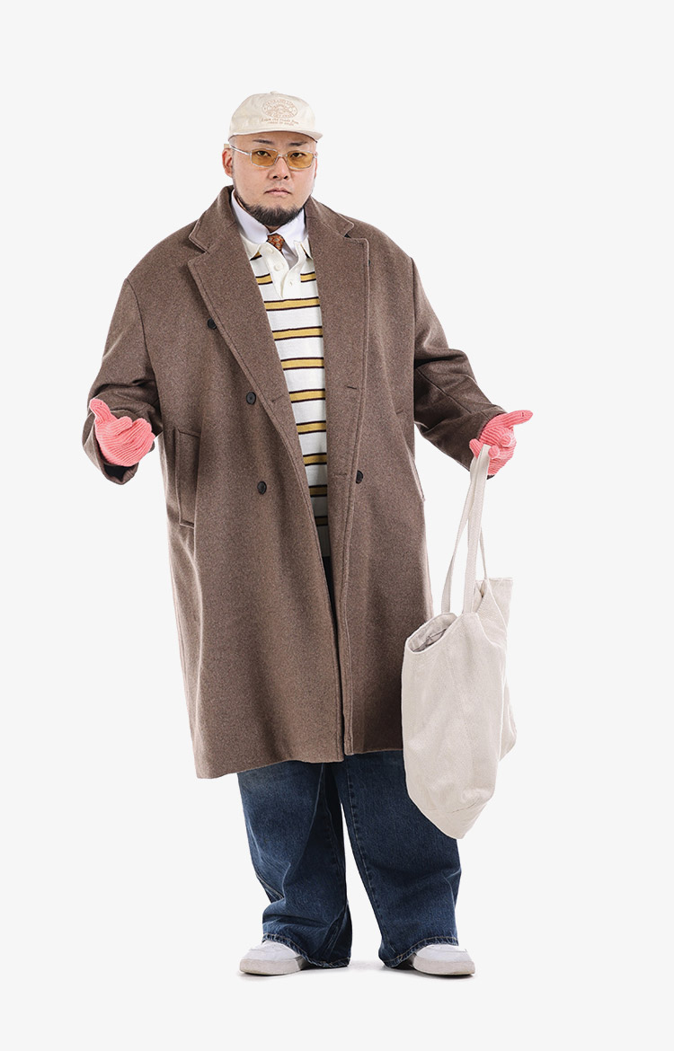 브라운 롱 코트와 스트라이프 니트, 캡과 에코백으로 캐주얼한 겨울 데일리 룩을 완성했다 착용 사이즈 : 상의 4XL~5XL / 하의 5XL스타일리스트 : Pilyeye