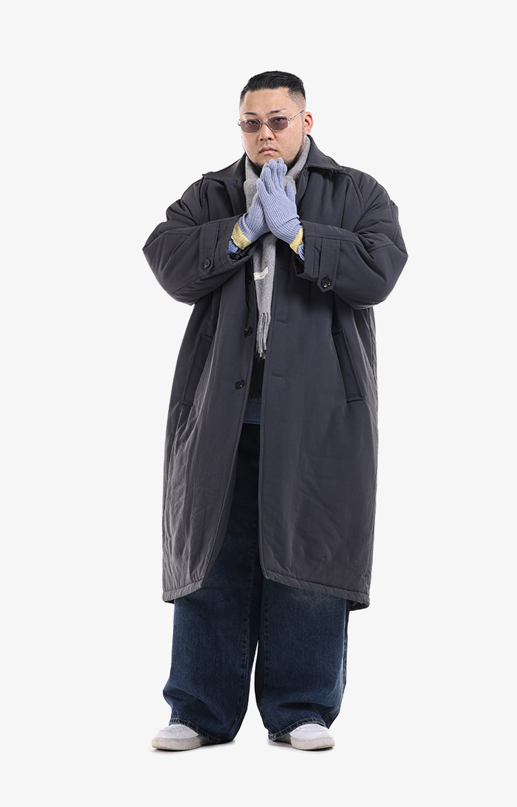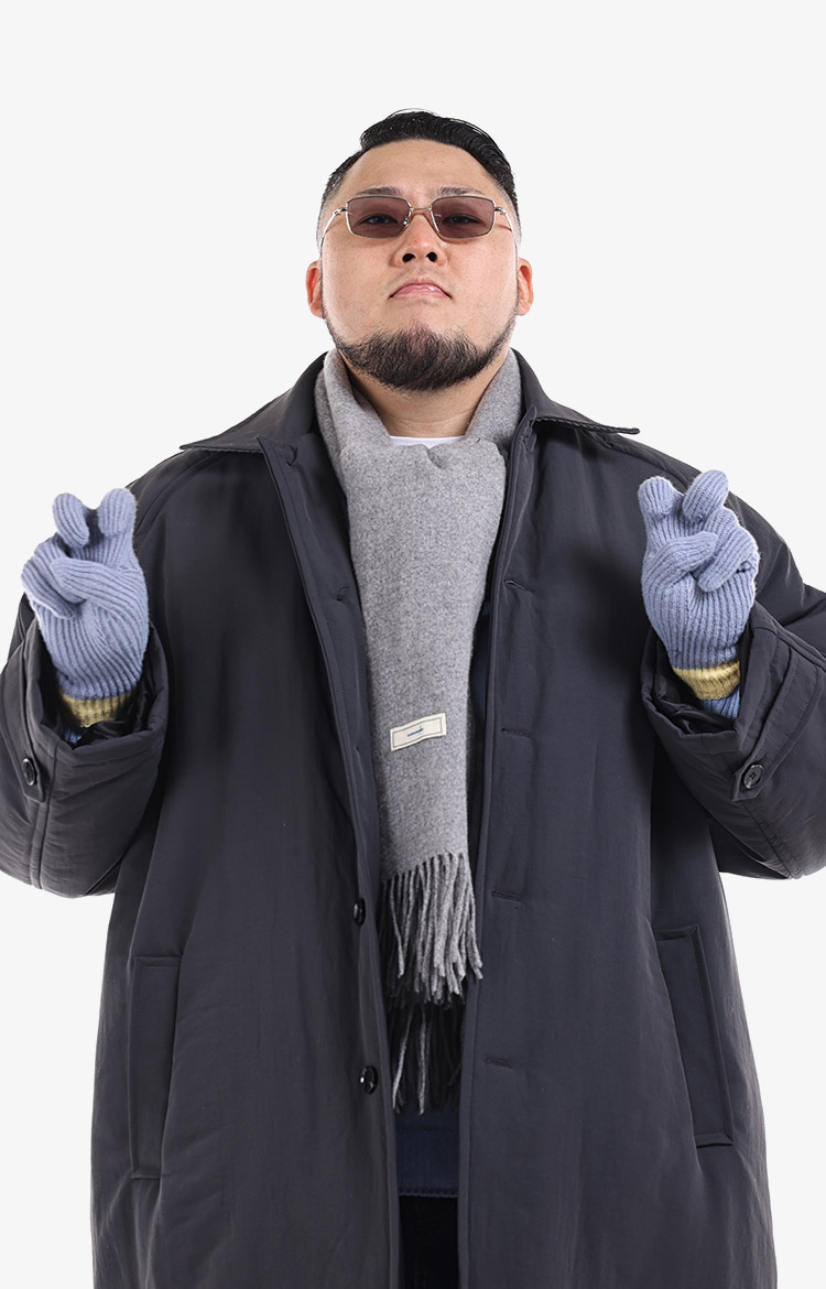차콜 그레이 롱 코트와 선글라스, 니트 장갑으로 시크하고 강렬한 겨울 비즈니스 룩을 연출했다. 착용 사이즈 : 상의 4XL~5XL / 하의 5XL스타일리스트 : Pilyeye