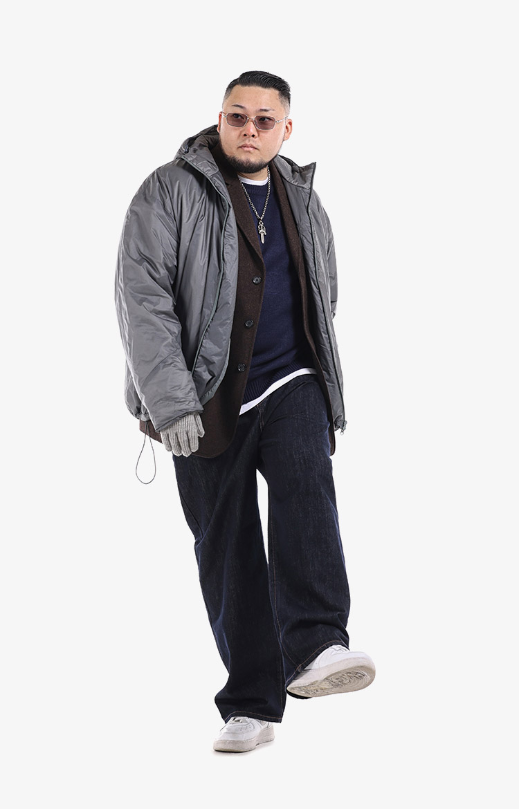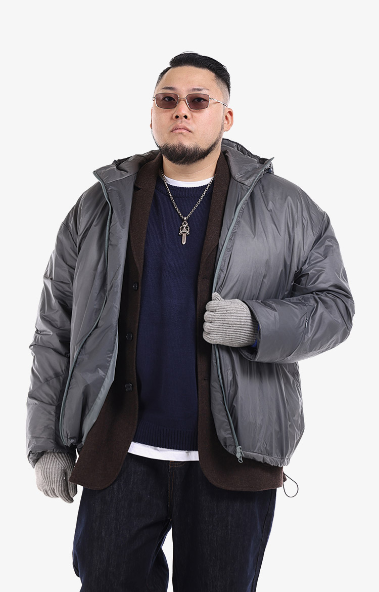 그레이 아노락 패딩과 브라운 니트 레이어링, 밀리터리 백으로 완성한 실용적인 윈터 스트리트 룩.