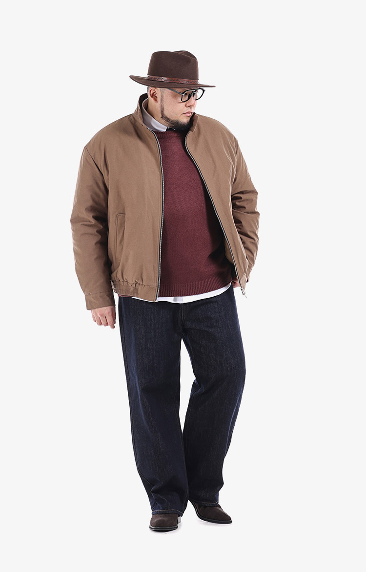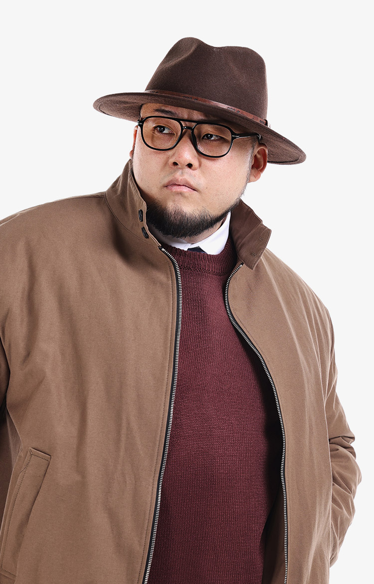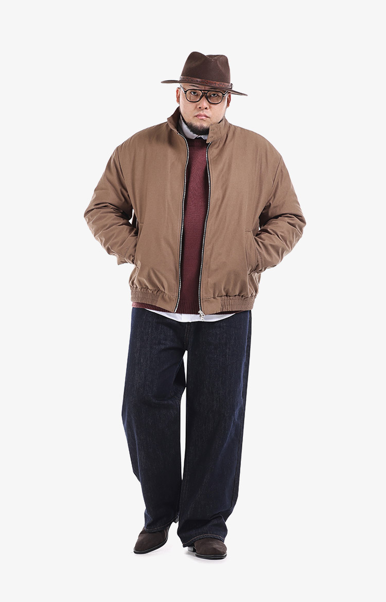 브라운 페도라와 블루종, 와인 컬러 니트에 데님 팬츠로 완성한 레트로 캐주얼 룩. 착용 사이즈 : 상의 4XL~5XL / 하의 5XL스타일리스트 : Pilyeye