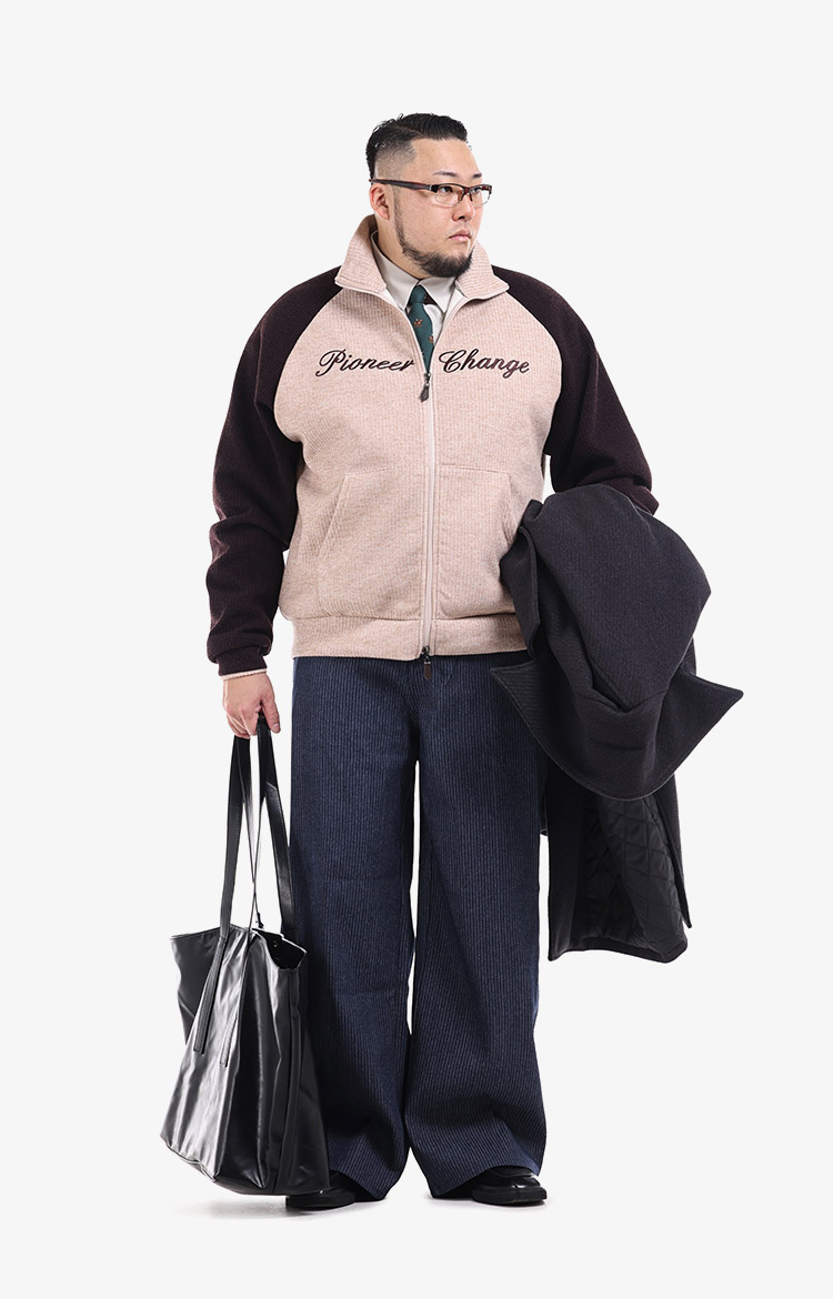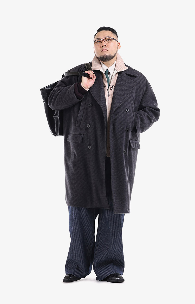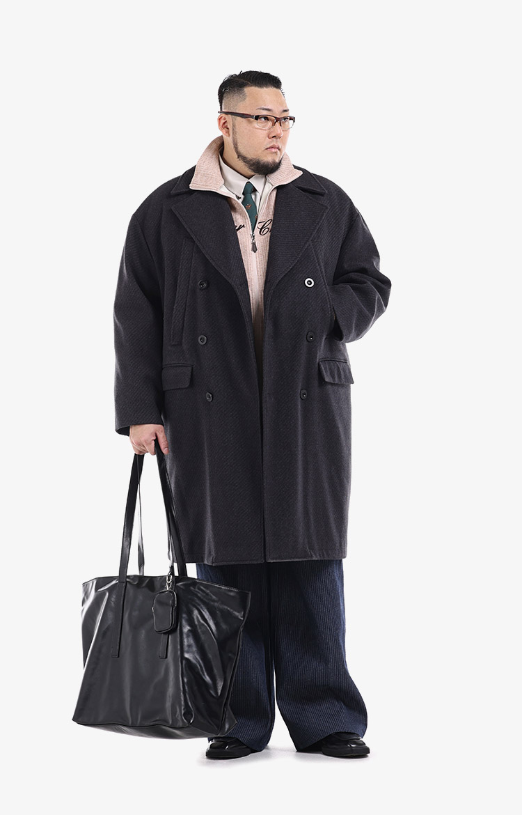 블랙 더블 코트와 베이지 집업 니트, 레더 백으로 구성한 시크한 비즈니스 포멀 룩. 착용 사이즈 : 상의 4XL~5XL / 하의 5XL스타일리스트 : Pilyeye