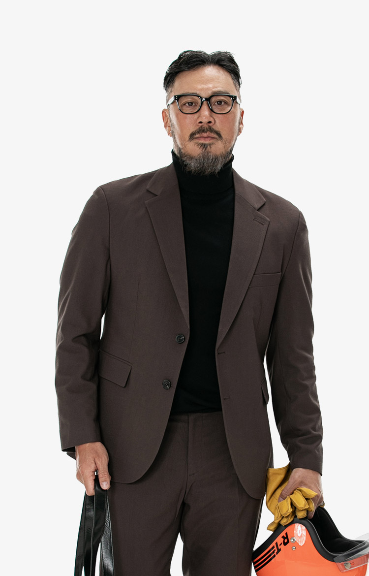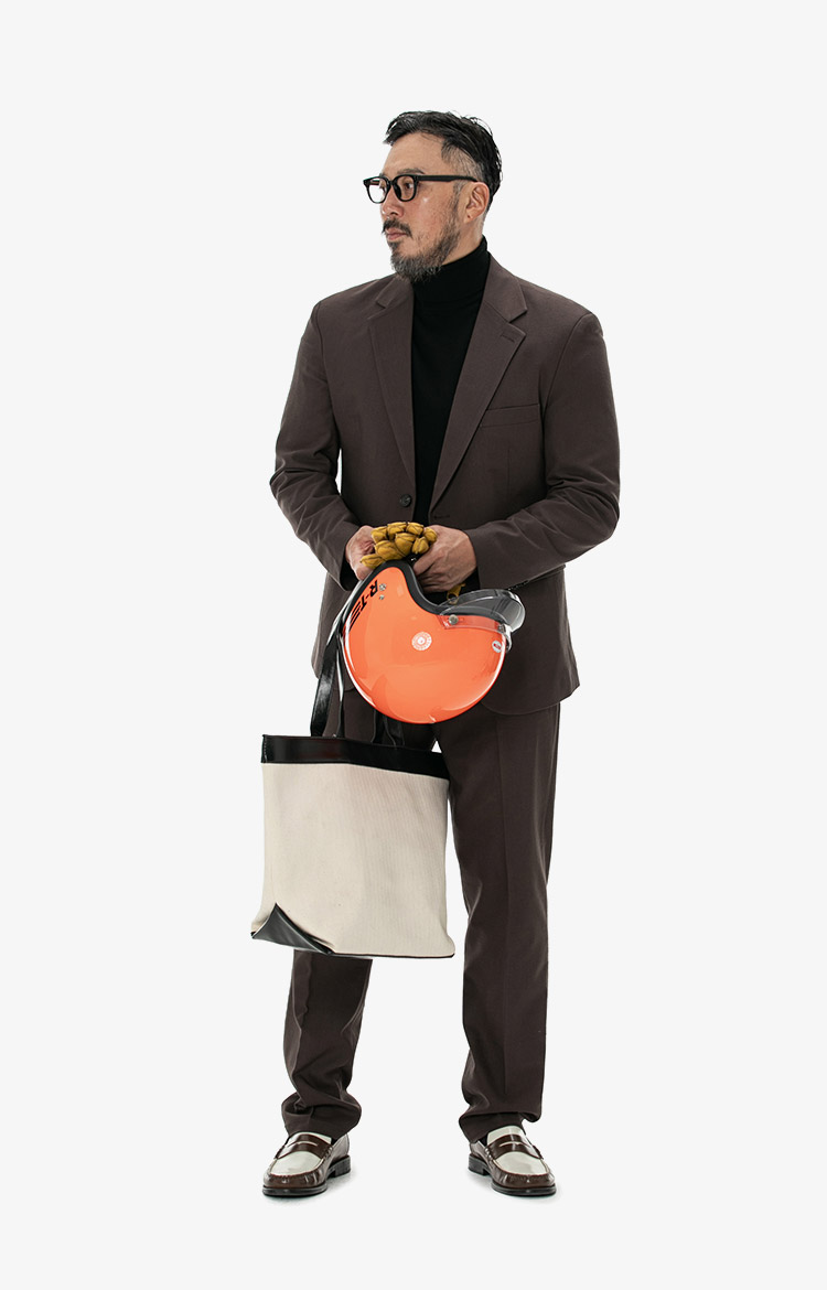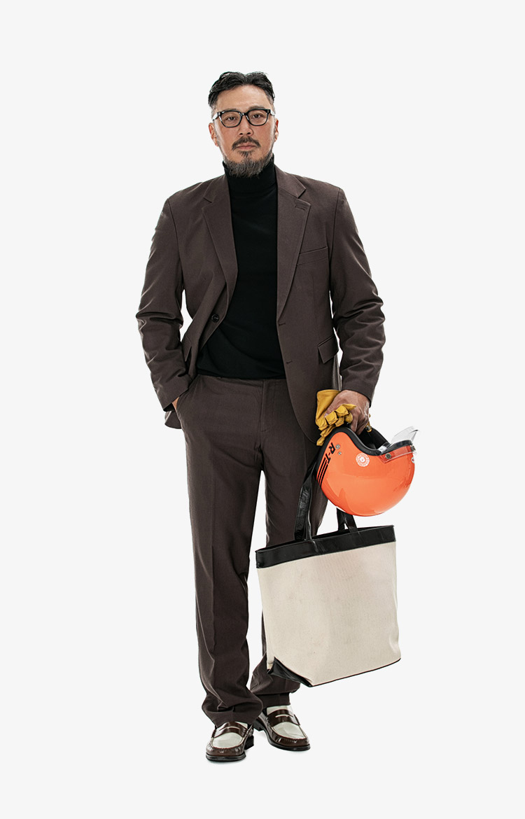 브라운 수트와 블랙 터틀넥의 클래식한 조합에 오렌지 헬멧과 에코백이라는 예상 밖의 소품으로 일상에 활력을 더한 스마트 캐주얼 룩. 착용 사이즈 : 상의 3XL / 하의 3XL스타일리스트 : Pilyeye