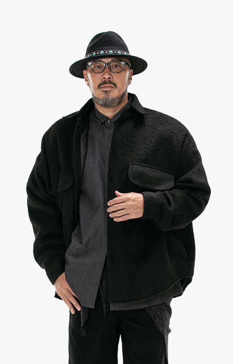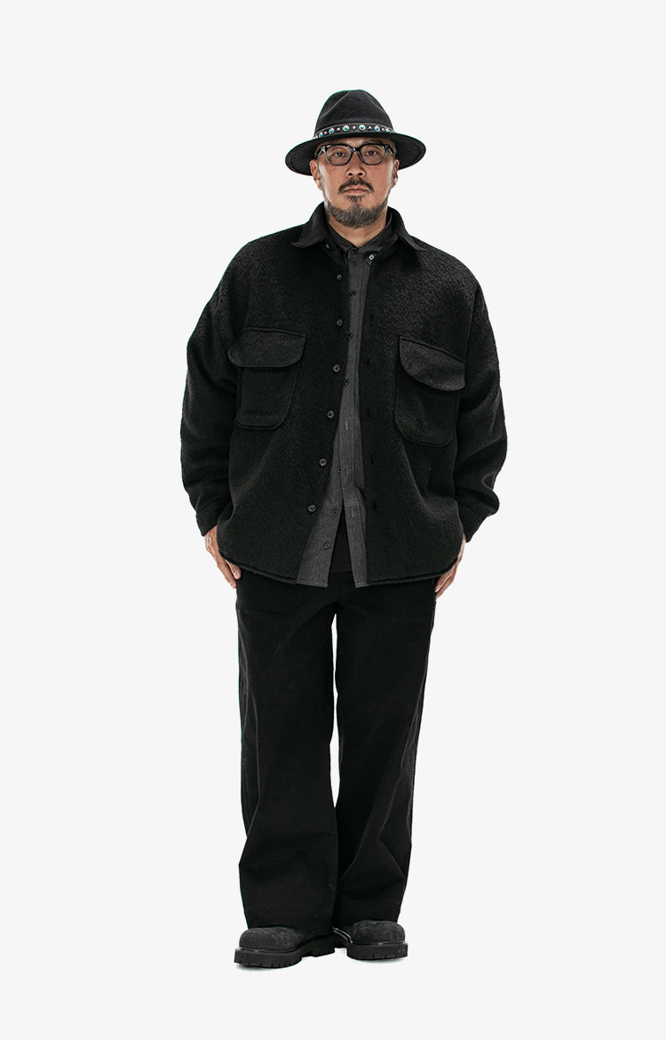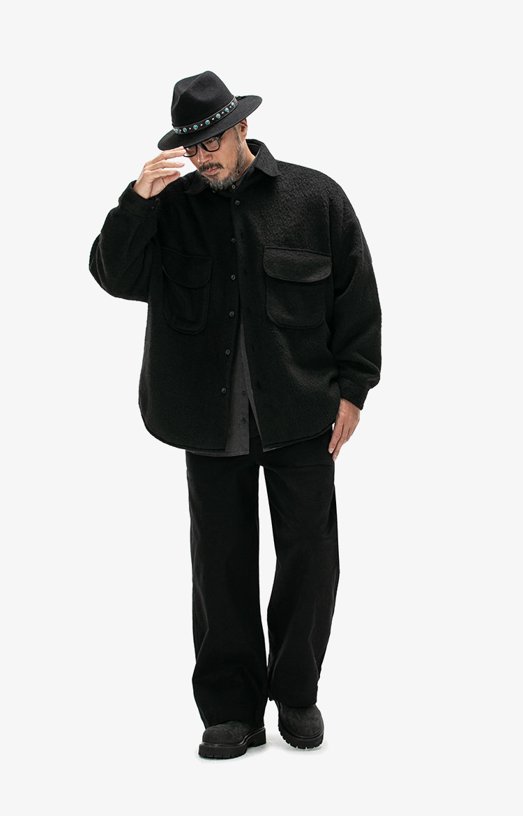 블랙 재킷과 와이드 팬츠로 완성한 모노톤 룩에 버킷햇으로 포인트를 준 겨울 스트리트 웨어. 착용 사이즈 : 상의 2XL~3XL / 하의 3XL스타일리스트 : Pilyeye
