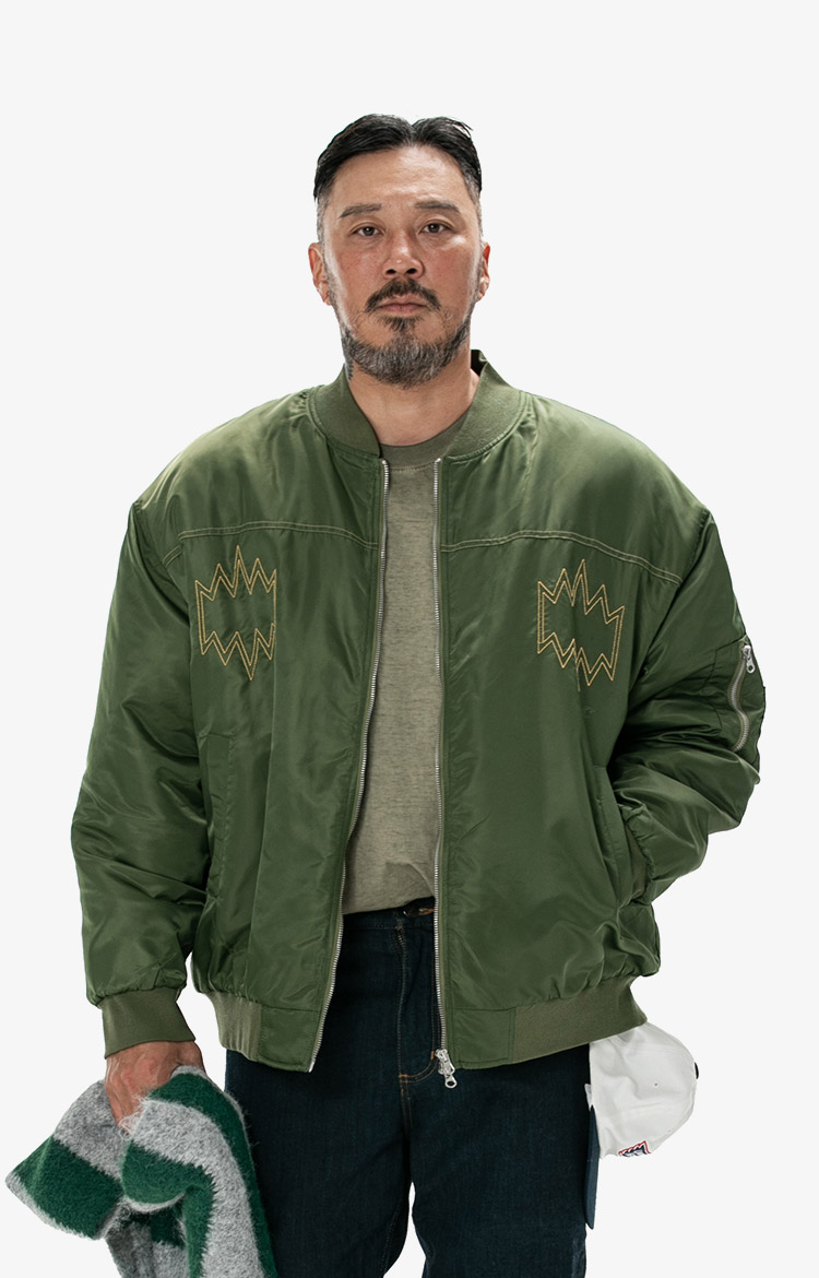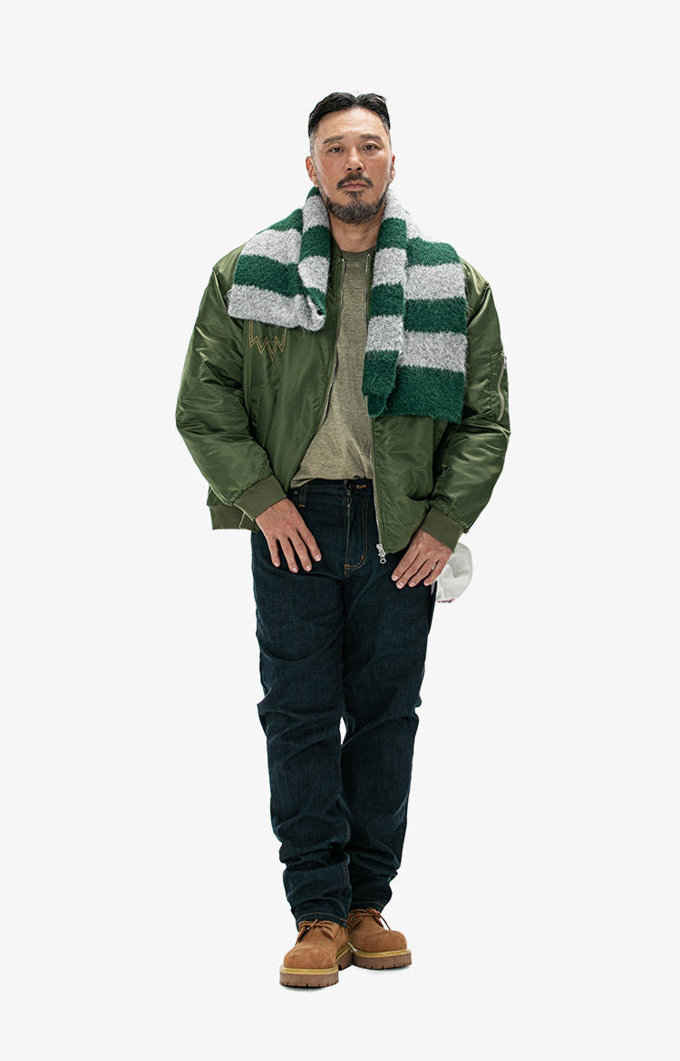 올리브 MA-1과 그린 스트라이프 머플러의 톤온톤 매칭으로 밀리터리 감성을 살린 캐주얼 데일리 룩.