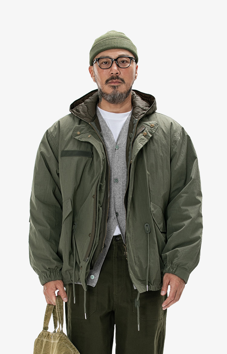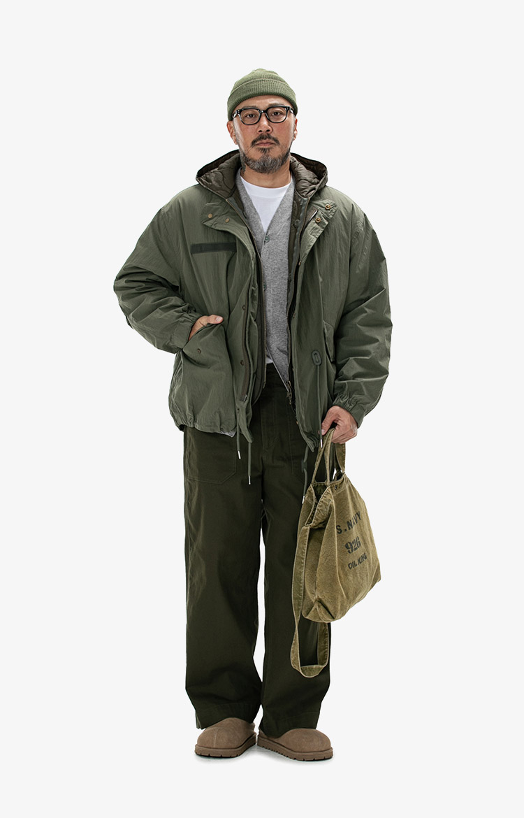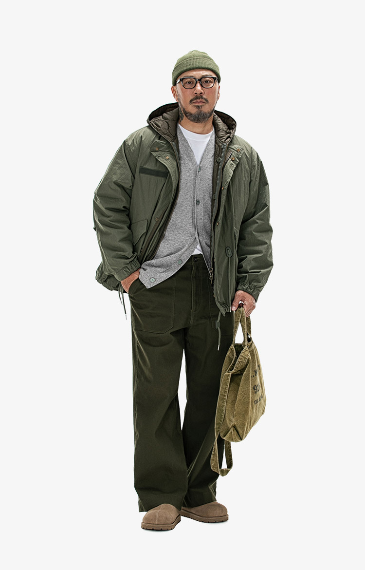올리브 밀리터리 재킷과 그레이 후드의 레이어링에 니트 캡과 밀리터리 백으로 완성한 어반 아웃도어 스타일. 착용 사이즈 : 상의 3XL~4XL / 하의 40스타일리스트 : Pilyeye