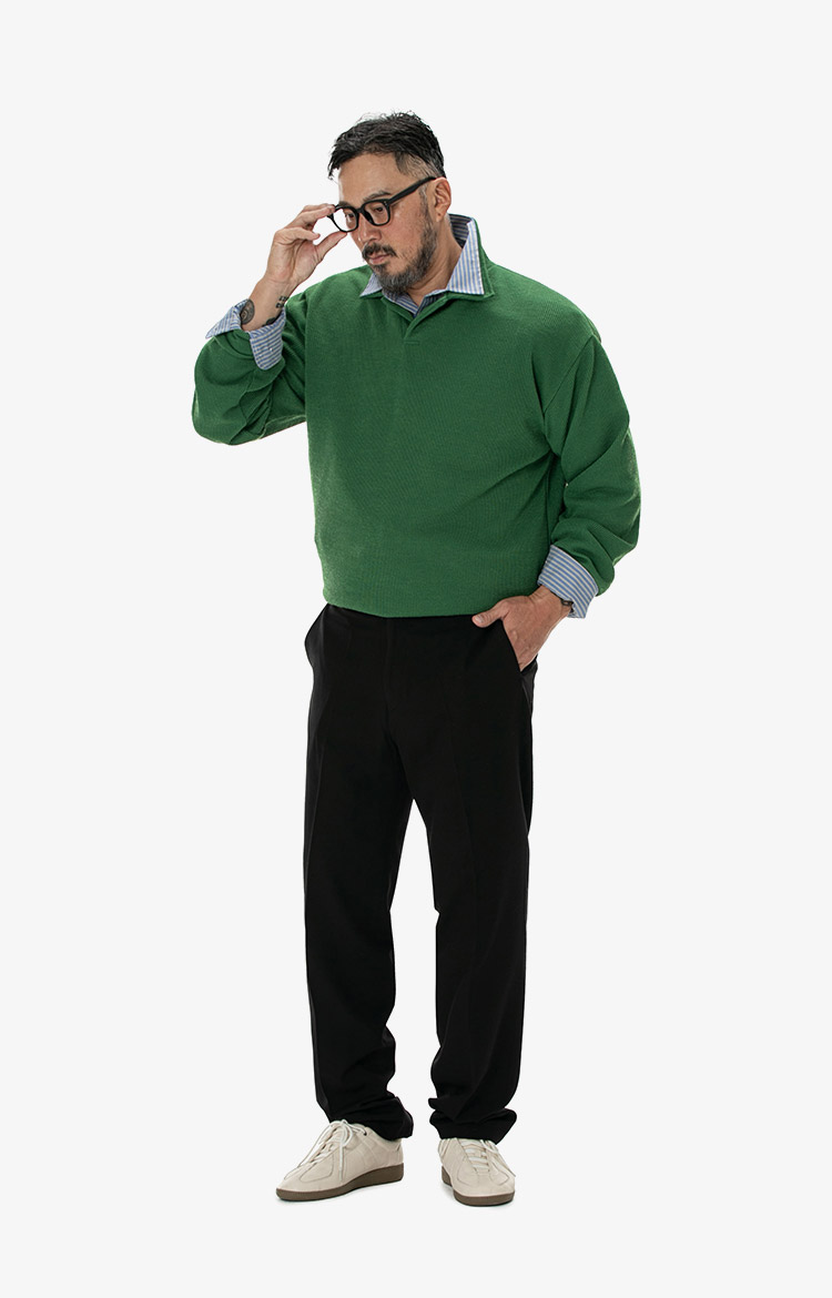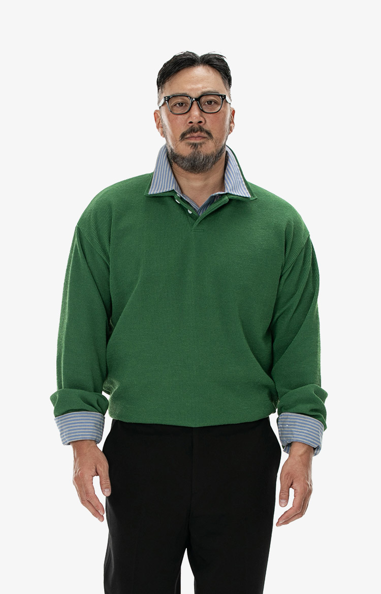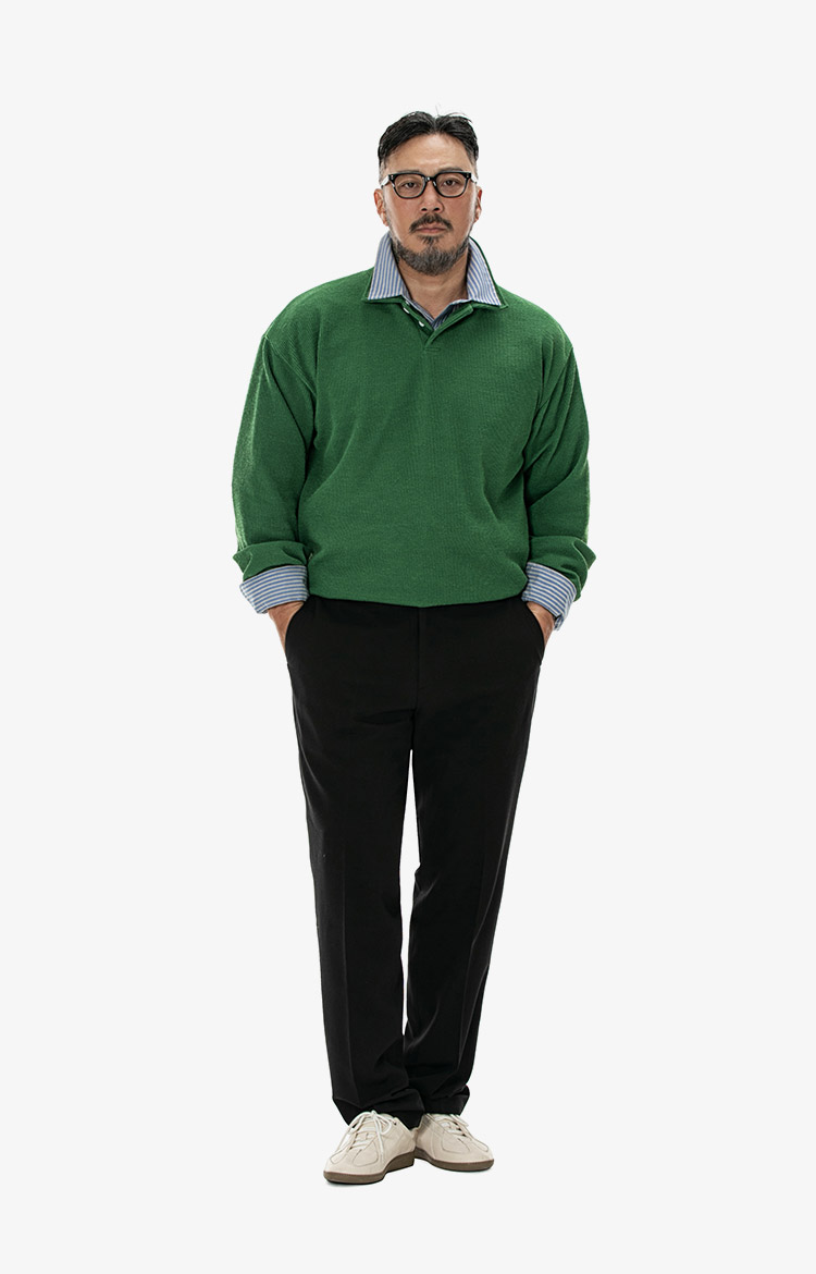 포레스트 그린 니트와 스트라이프 칼라의 조합으로 완성한 리릭스드 프레피 룩. 착용 사이즈 : 상의 3XL / 하의 3XL스타일리스트 : Pilyeye