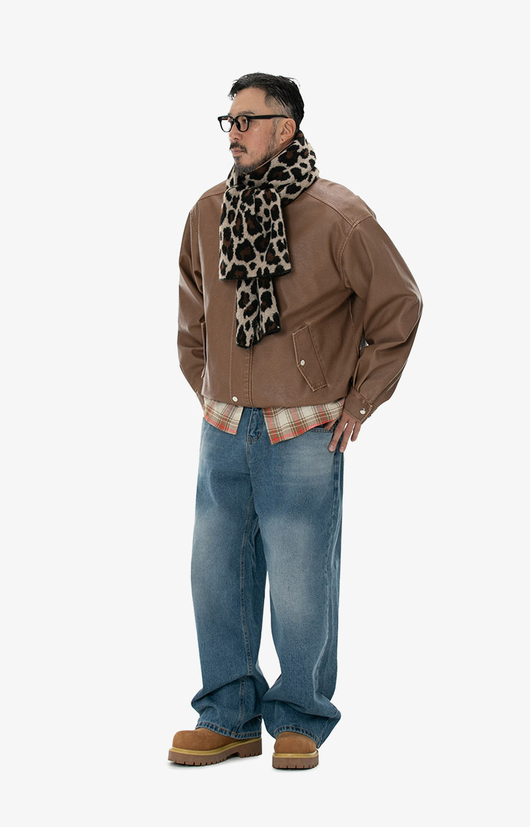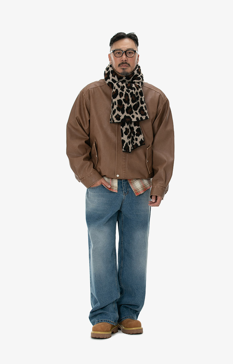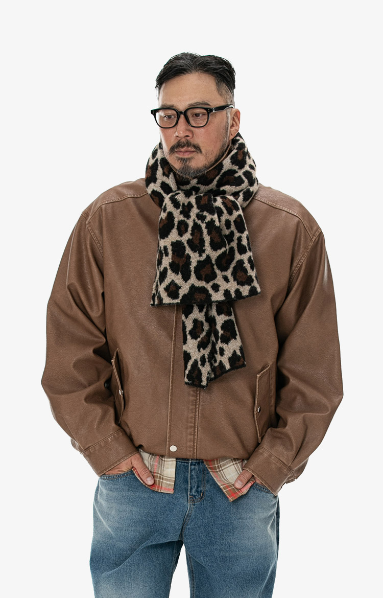 브라운 니트와 레오파드 머플러, 블루 데님으로 완성한 캐주얼 위크엔드 룩. 착용 사이즈 : 상의 3XL / 하의 36스타일리스트 : Pilyeye