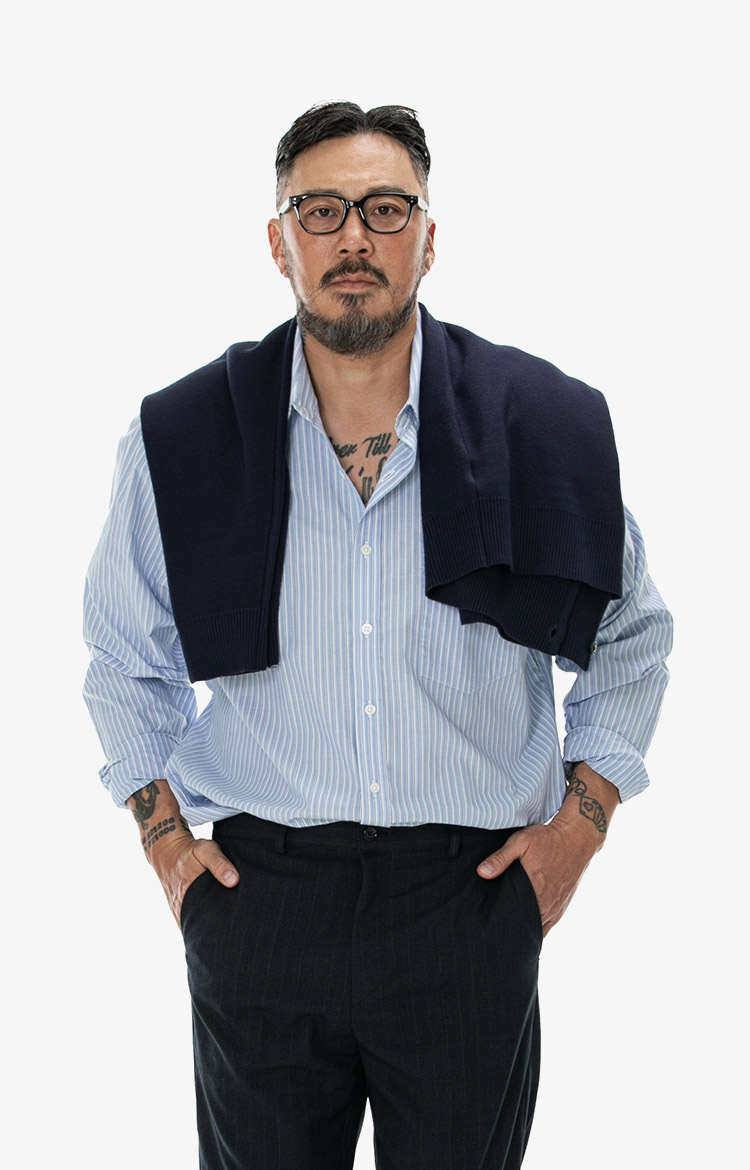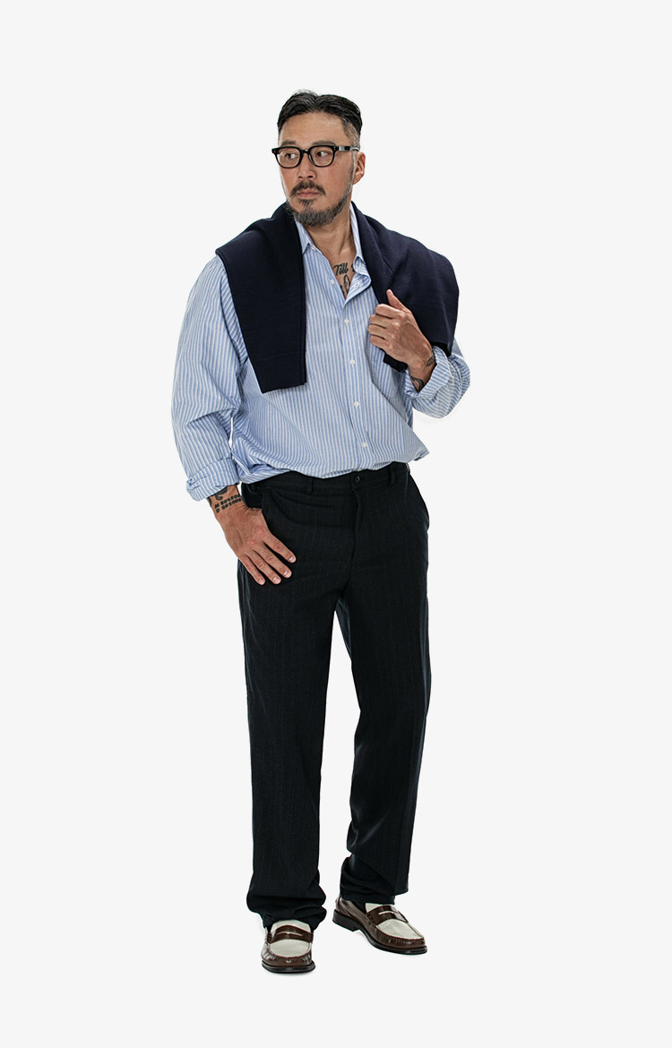 니트를 머플러처럼 활용해 스트라이프 셔츠의 조합으로 완성한 레이어드 비즈니스 캐주얼.