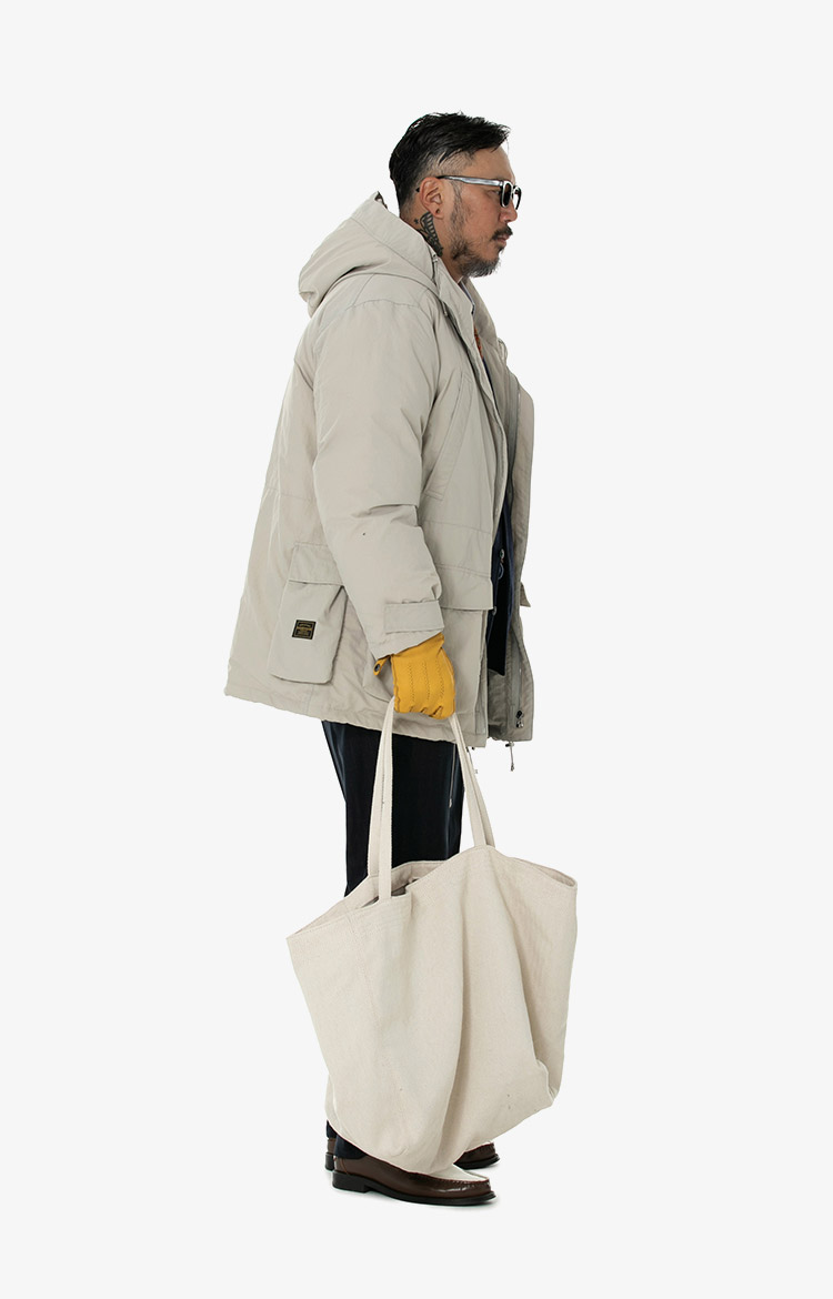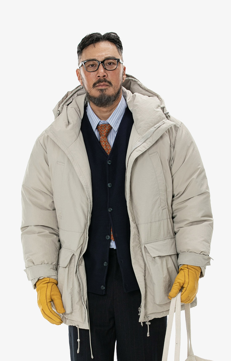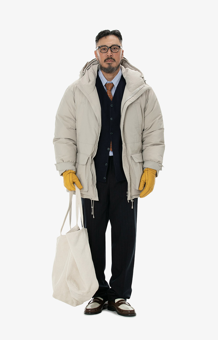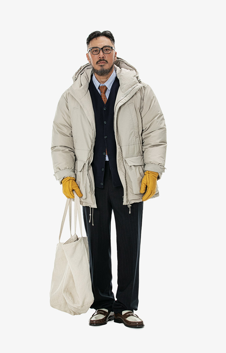 베이지 패딩과 클래식 코디에 타이를 믹스매치로 완성한 하이브리드 윈터 룩. 착용 사이즈 : 상의 3XL / 하의 36스타일리스트 : Pilyeye