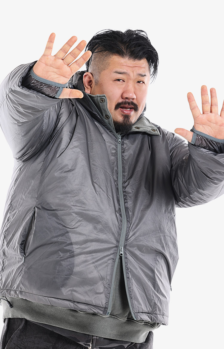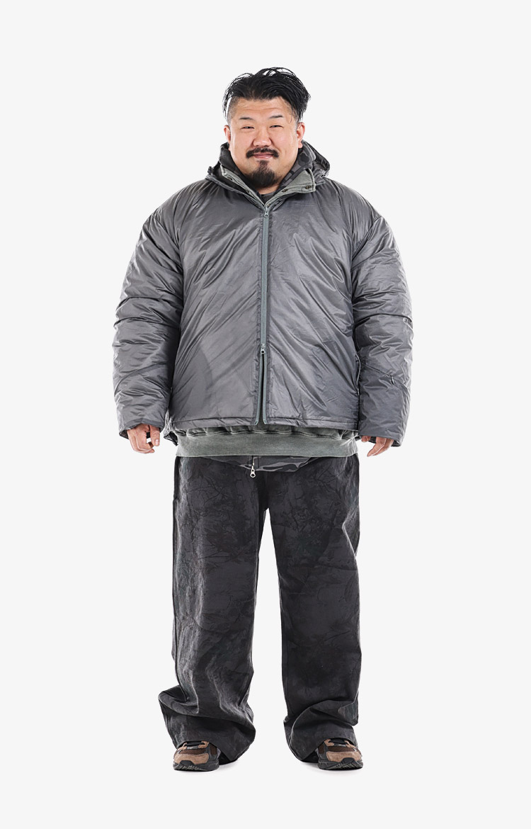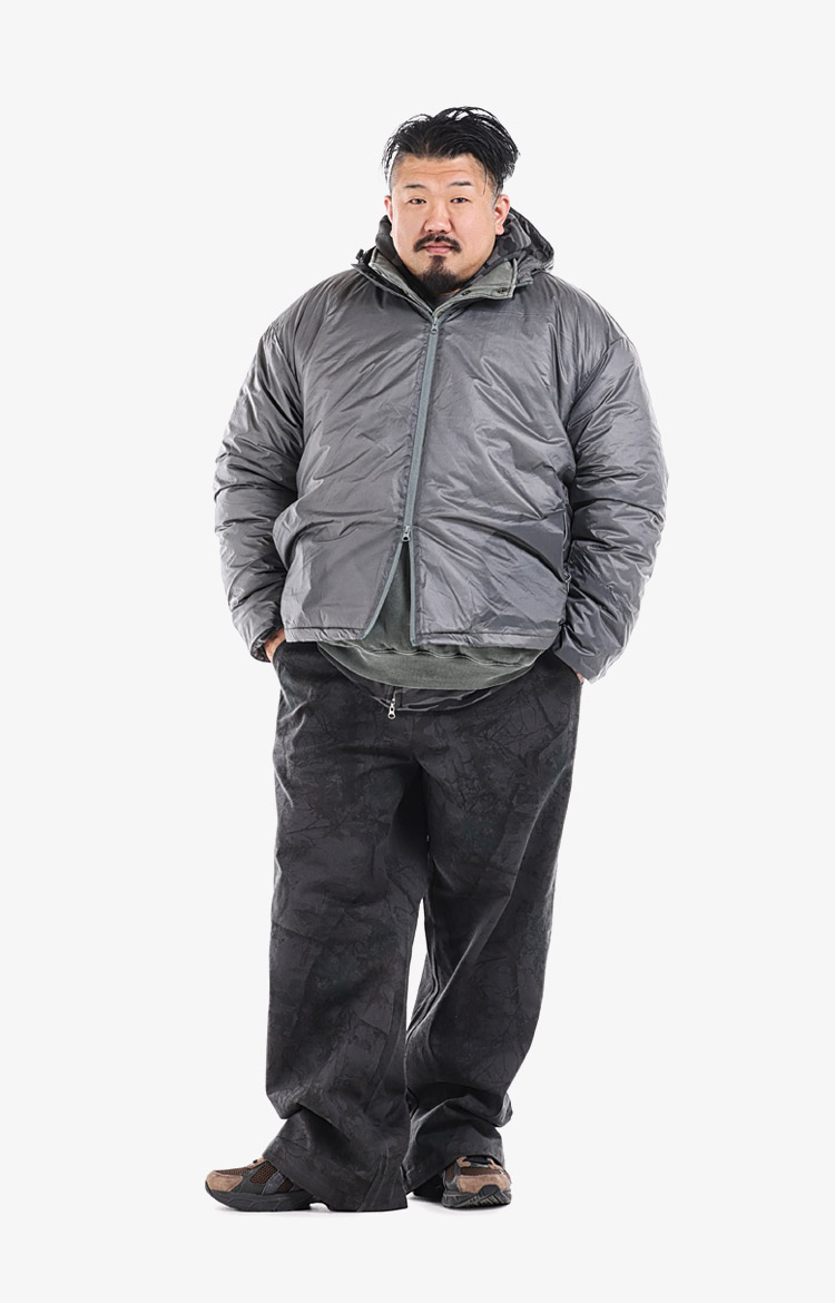 그레이 나일론 후드 윈드브레이커와 카키 이너, 블랙 카모 와이드 팬츠로 구성한 테크 웨어 감성의 아웃도어 캐주얼룩.착용 사이즈 : 상의 4XL~5XL / 하의 5XL스타일리스트 : pilyeye
