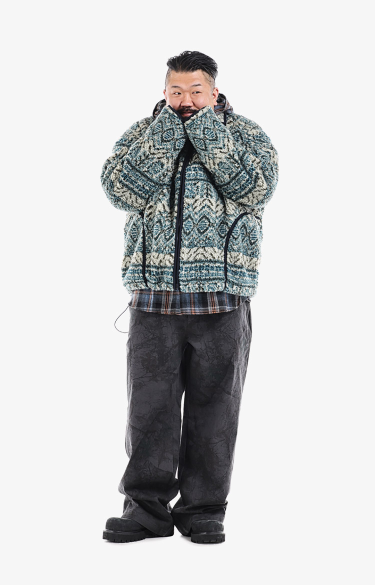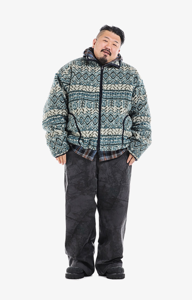 피그먼트 워싱 하프 집업 스웨트셔츠와 카모 패턴 이너의 레이어링으로 완성한 어반 캐주얼. 와이드 카고 팬츠가 릴렉스한 실루엣을 완성한다.