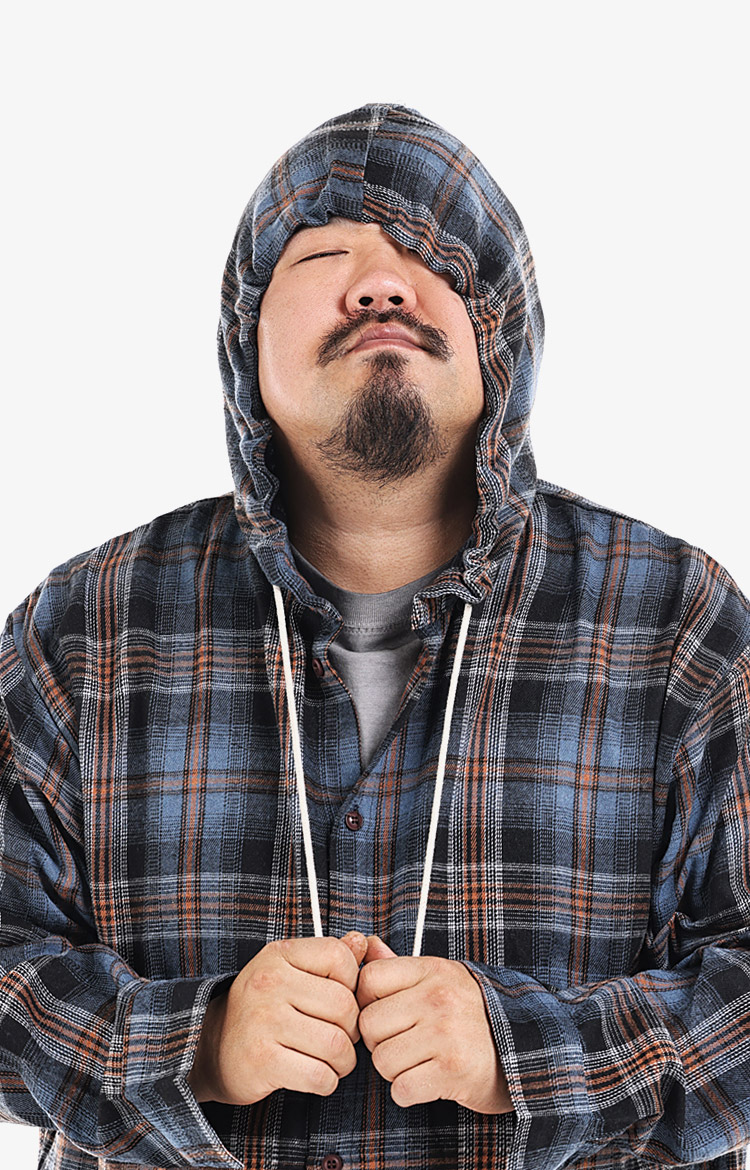 그레이와 베이지의 컬러 블록 플리스 아노락에 체크 셔츠를 레이어드 한 고프코어 스타일. 와이드 치노 팬츠가 편안한 실루엣을 완성한다.