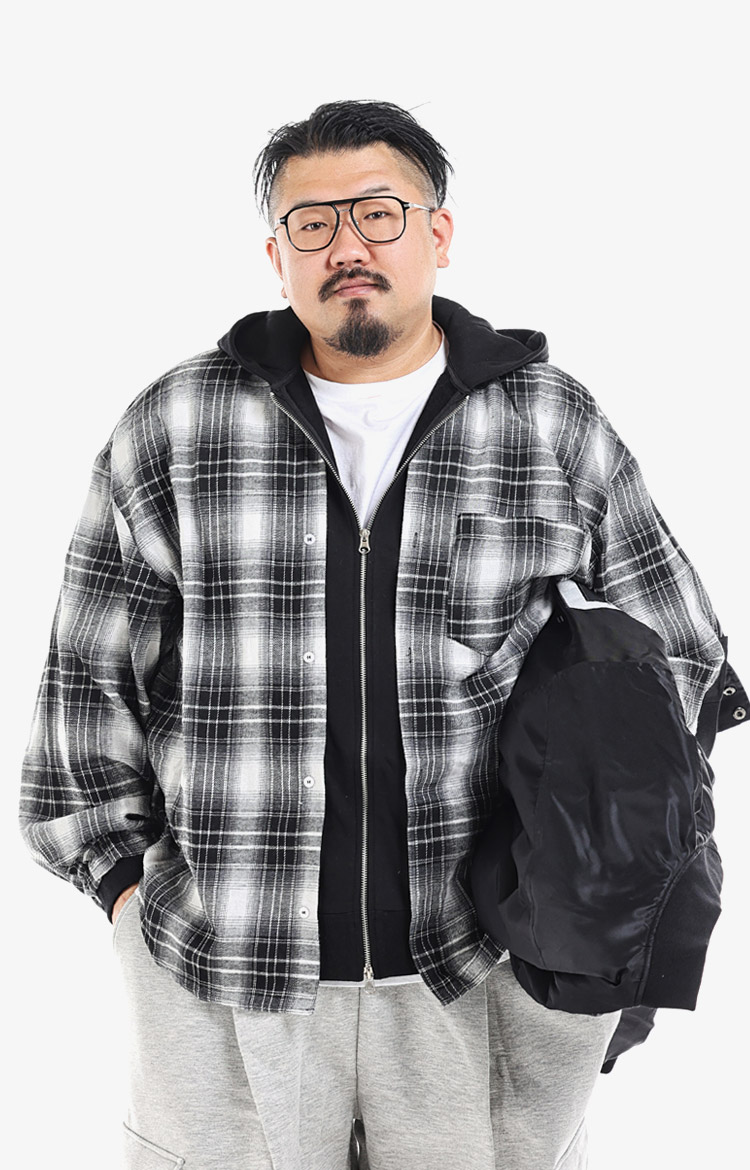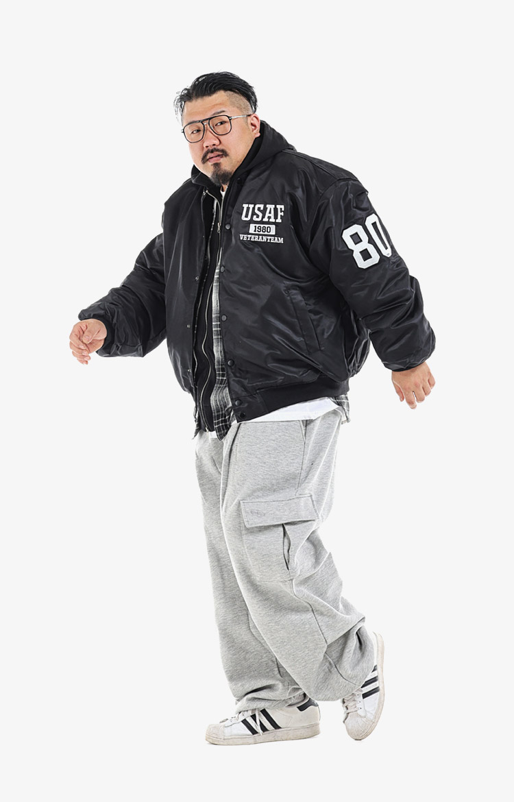 블랙 스타디움 재킷과 후드집업, 체크 셔츠의 멀티 레이어링. 그레이 카고 스웻 팬츠와 스니커즈로 애슬레저와 밀리터리의 경계를 넘나든다.