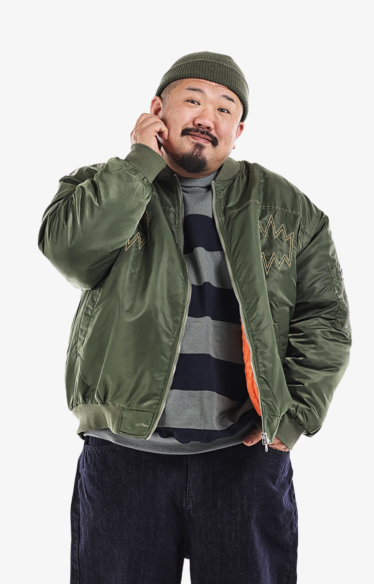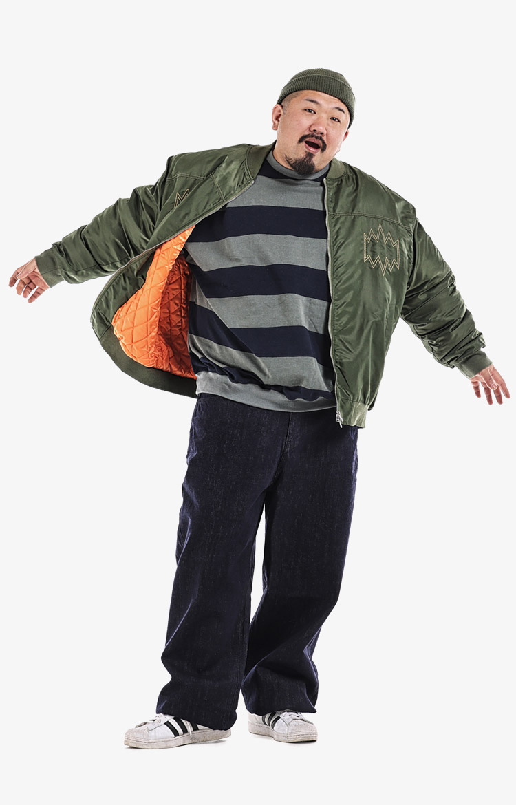 오버사이즈 더블 재킷에 브라운 페도라로 무드 전환. 스트릿 베이스에 클래식 헤드피스 하나로 댄디 무드 완성.착용 사이즈 : 상의 4XL~5XL / 하의 5XL스타일리스트 : pilyeye
