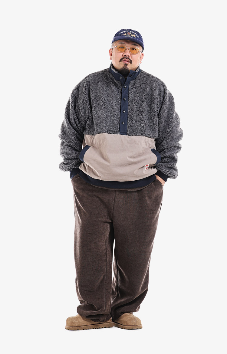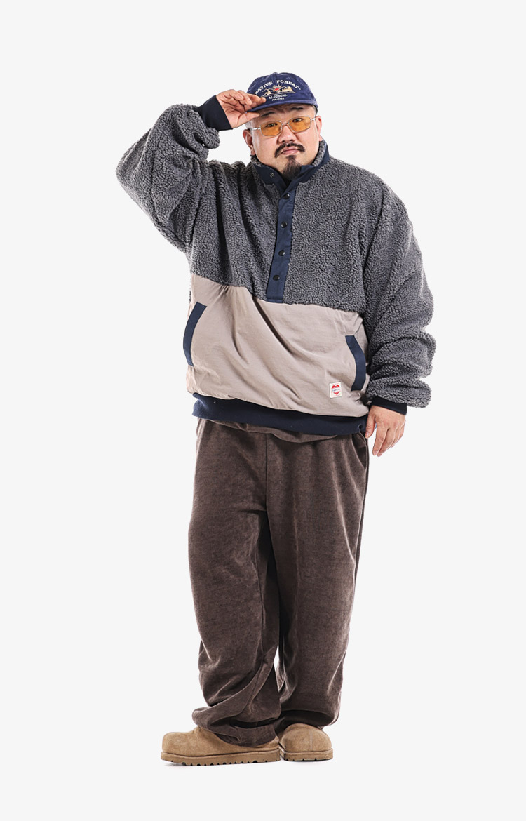 그레이 × 베이지 × 네이비 트리플 컬러 블록 플리스. 90년대 아웃도어 아카이브 무드를 캡과 코듀로이로 마무리.착용 사이즈 : 상의 4XL~5XL / 하의 5XL스타일리스트 : pilyeye