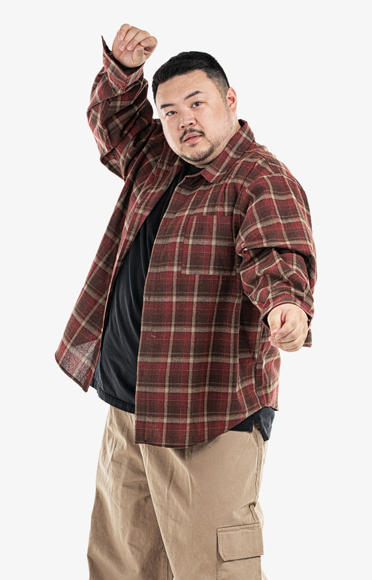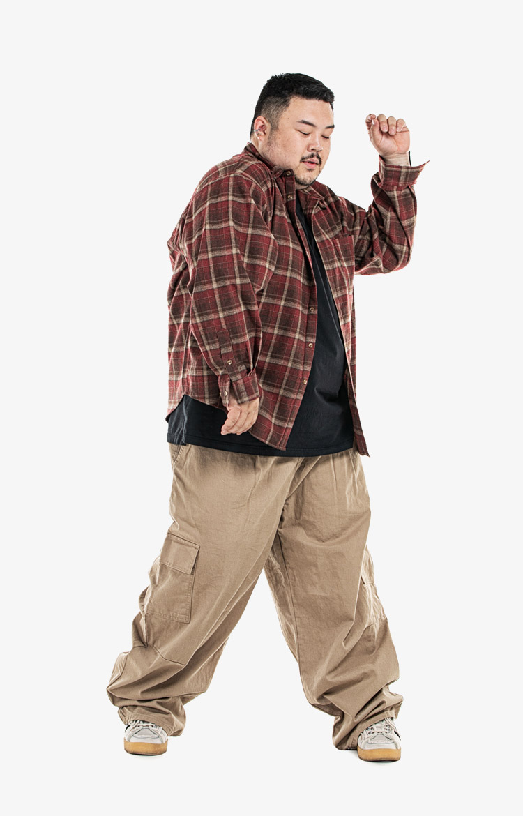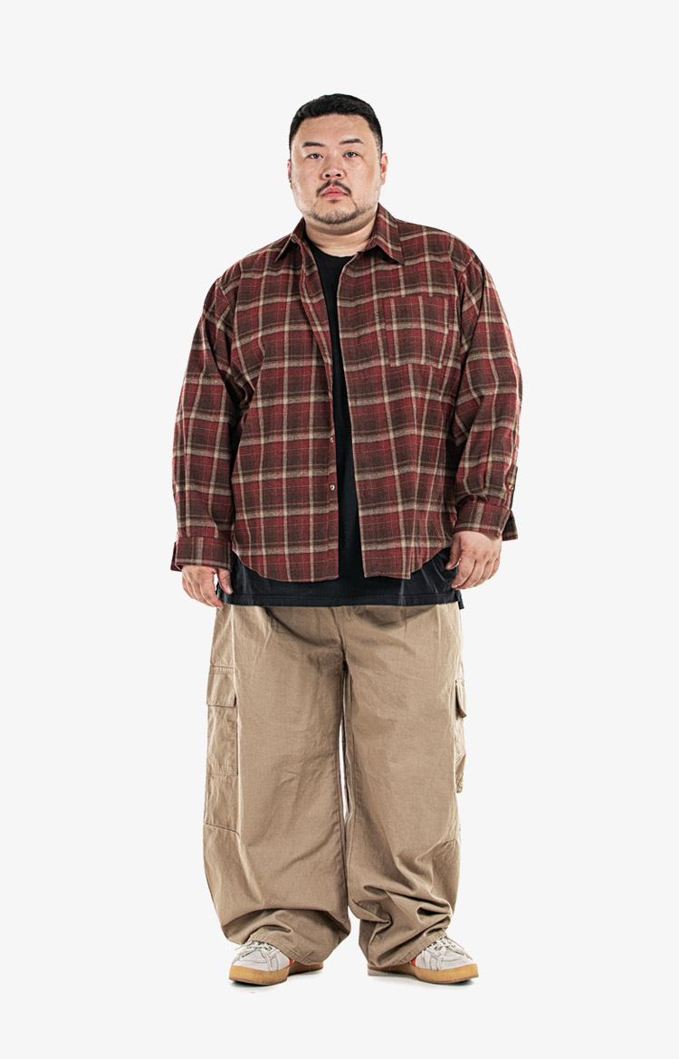 레드 셔츠와 베이지 카고 팬츠를 매치한 스타일링착용 사이즈 : 상의 4XL~5XL / 하의 5XL스타일리스트 : SCENE