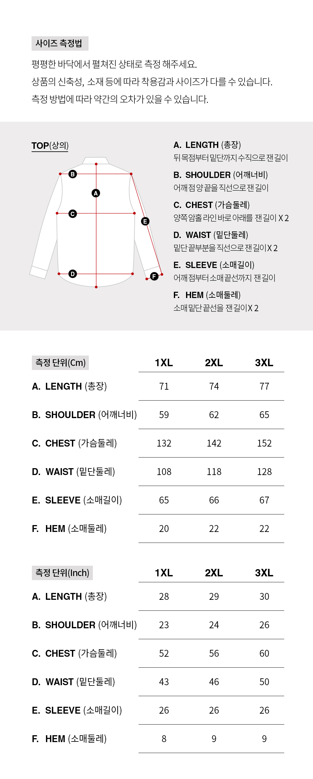 - 상품 상세란의 사이즈표는 업체 기준 측정정보 입니다.