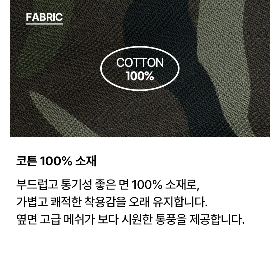 ⦁ 강인함이 느껴지는 밀리터리 패턴과 메쉬원단의 고급스러운 마감처리로