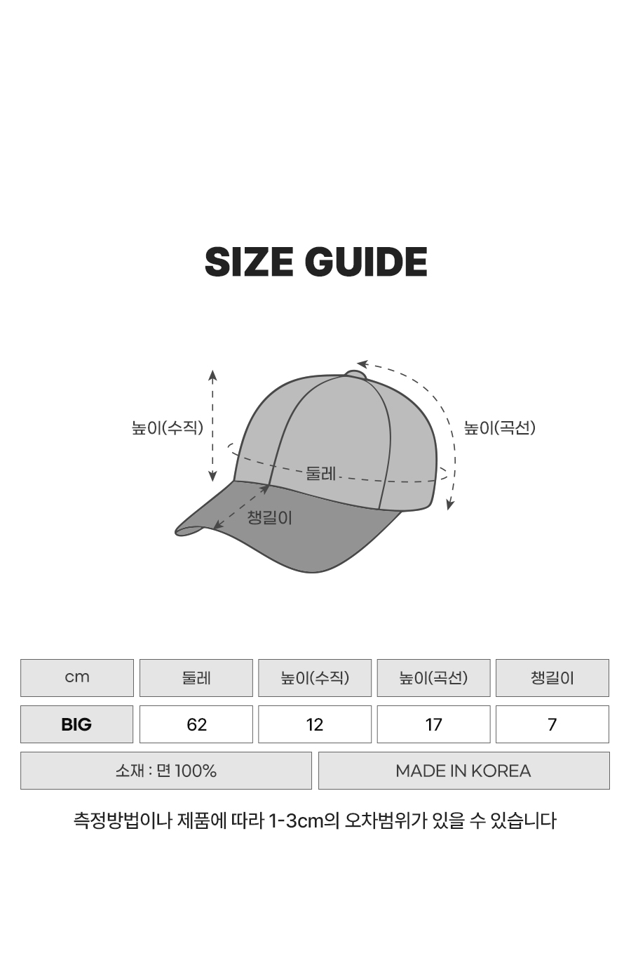 | 챙길이 | 둘레 | 높이 | |