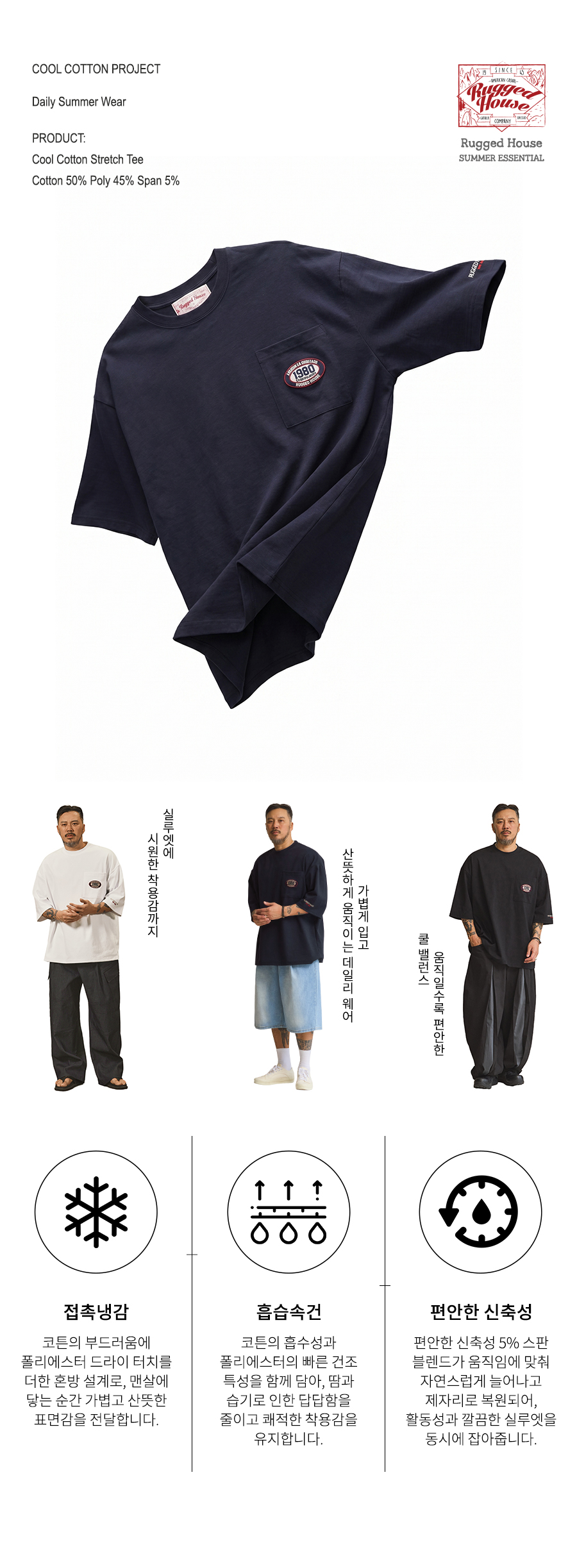 ⦁ 쿨코튼 원단이 주는 편안한 착용감과 여유 있는 실루엣으로 데님, 치노, 쇼츠와 두루 어울리는 아메리칸 캐주얼 반팔티입니다.
