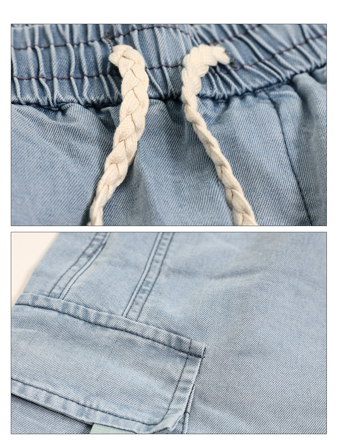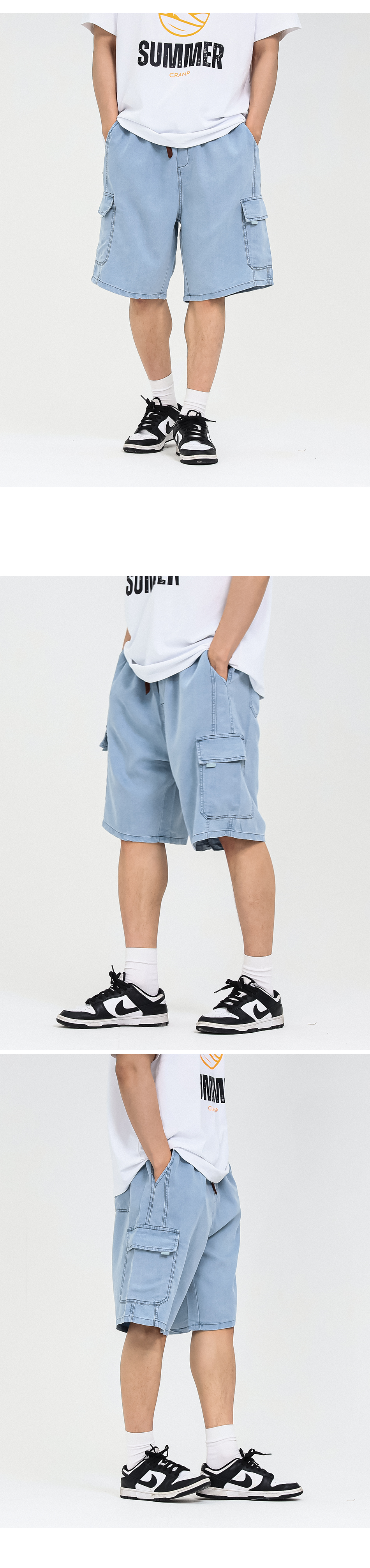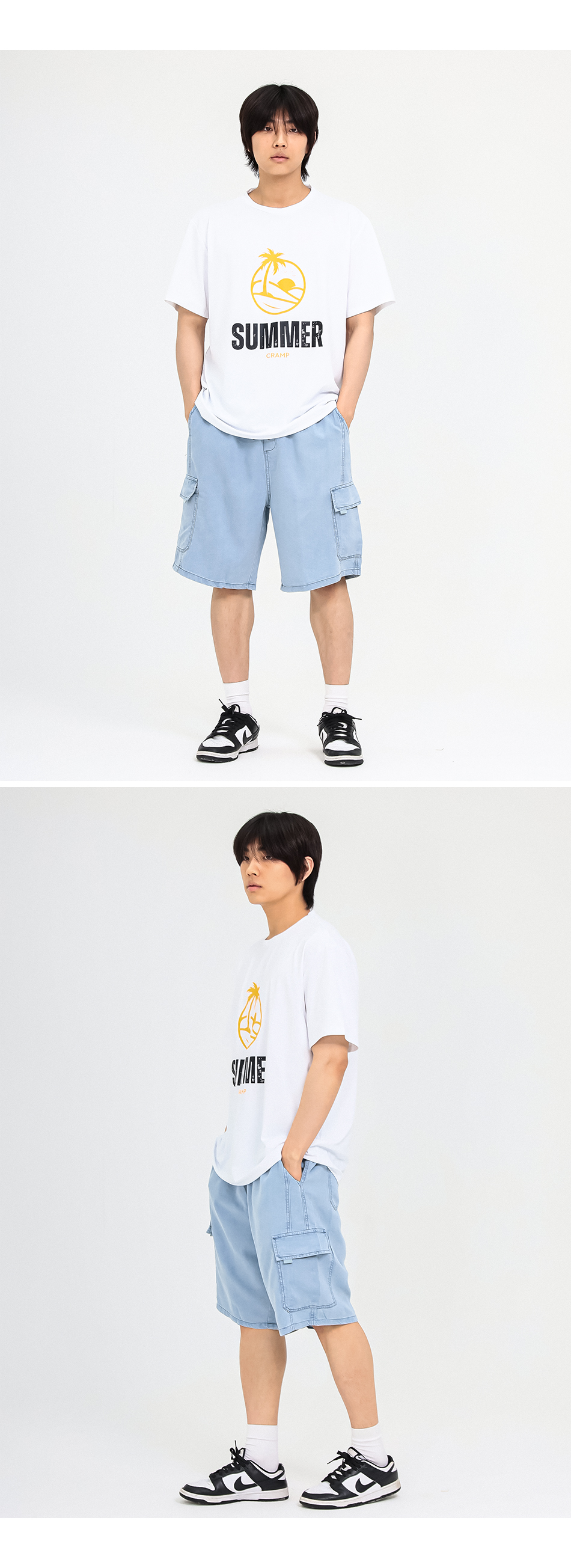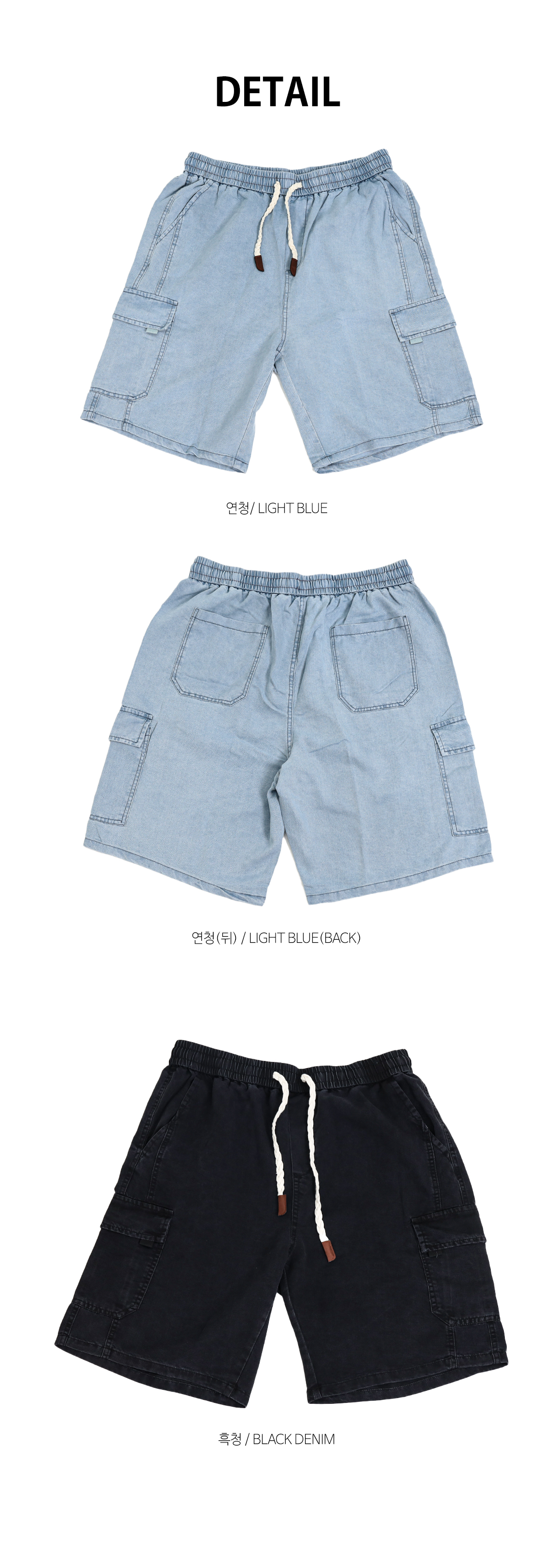 쿨링원단으로 한여름 시원하게 입기 좋고 허리밴딩으로 편안한 착용감과 카고포켓으로 포인트를 준 청반바지