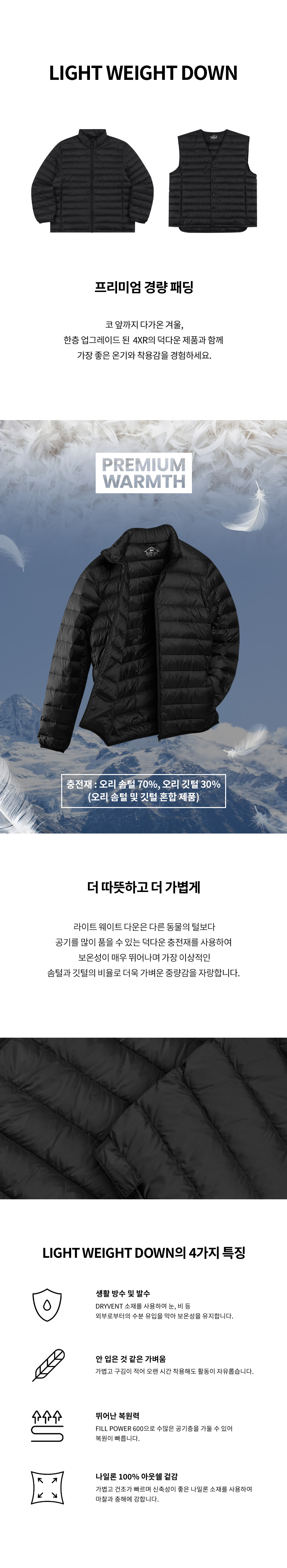 | 소재 | 겉감 : 나일론 100% 충전재 : 오리 솜털 70%, 오리 깃털 30% |
