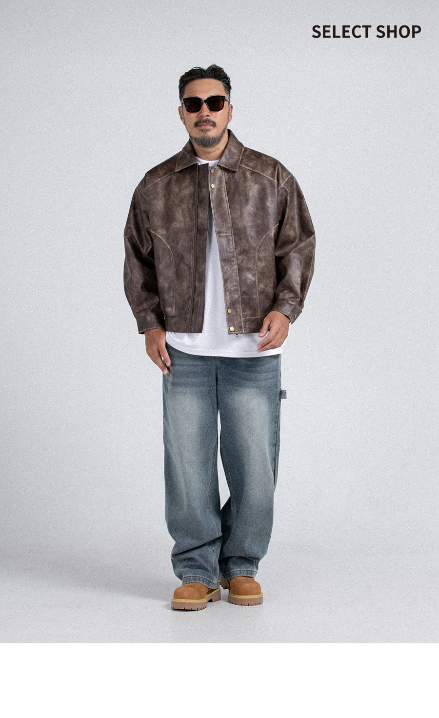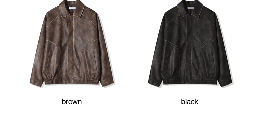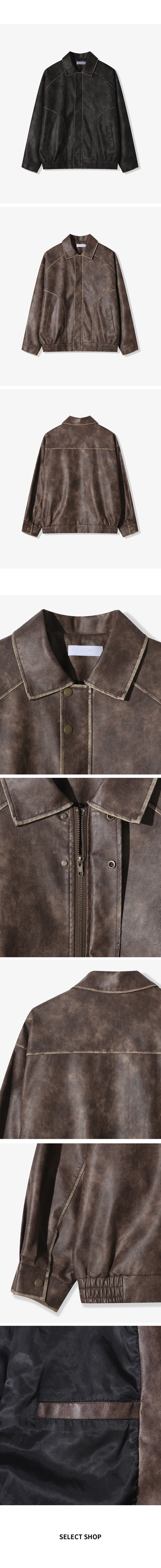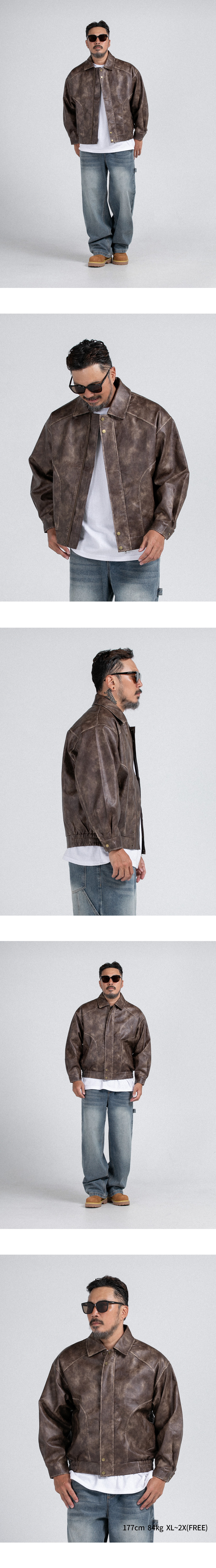 ⦁ 빈티지한 워싱 질감이 특징인 synthetic 레더 소재로 제작되어 트렌디한 무드를 선사하는 오버핏 실루엣의 집업 점퍼입니다