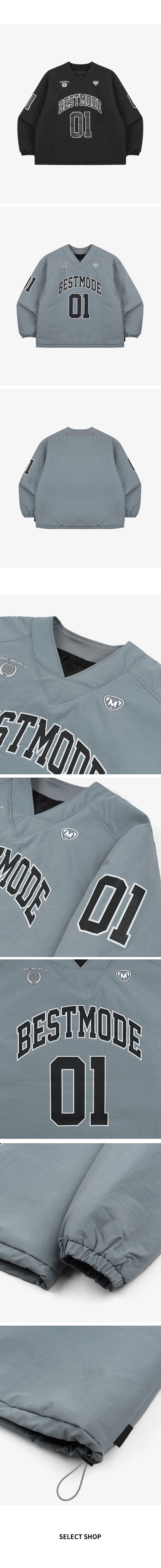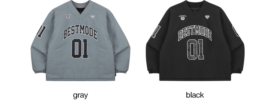 ⦁ 스포티한 넘버링과 레터링 프린트가 유니크한 무드를 연출하는 패딩 브이넥 풀오버입니다.