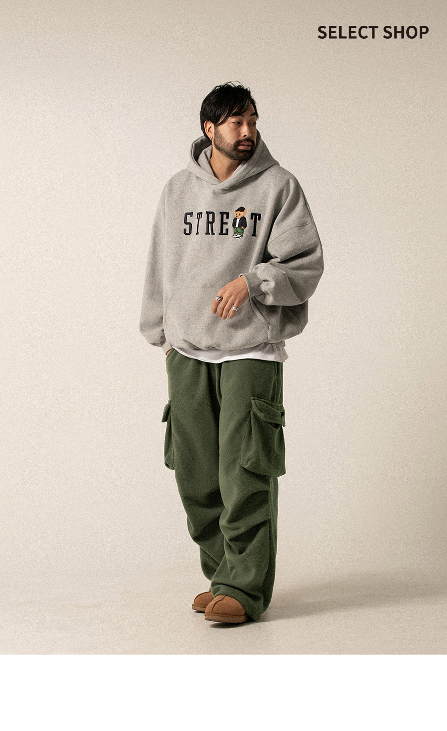 ⦁ 양 사이드의 카고 주머니 디테일은 실용적인 수납을 도와줄 뿐만 아니라, 워크웨어 스타일의 감각적인 포인트를 더해줍니다.